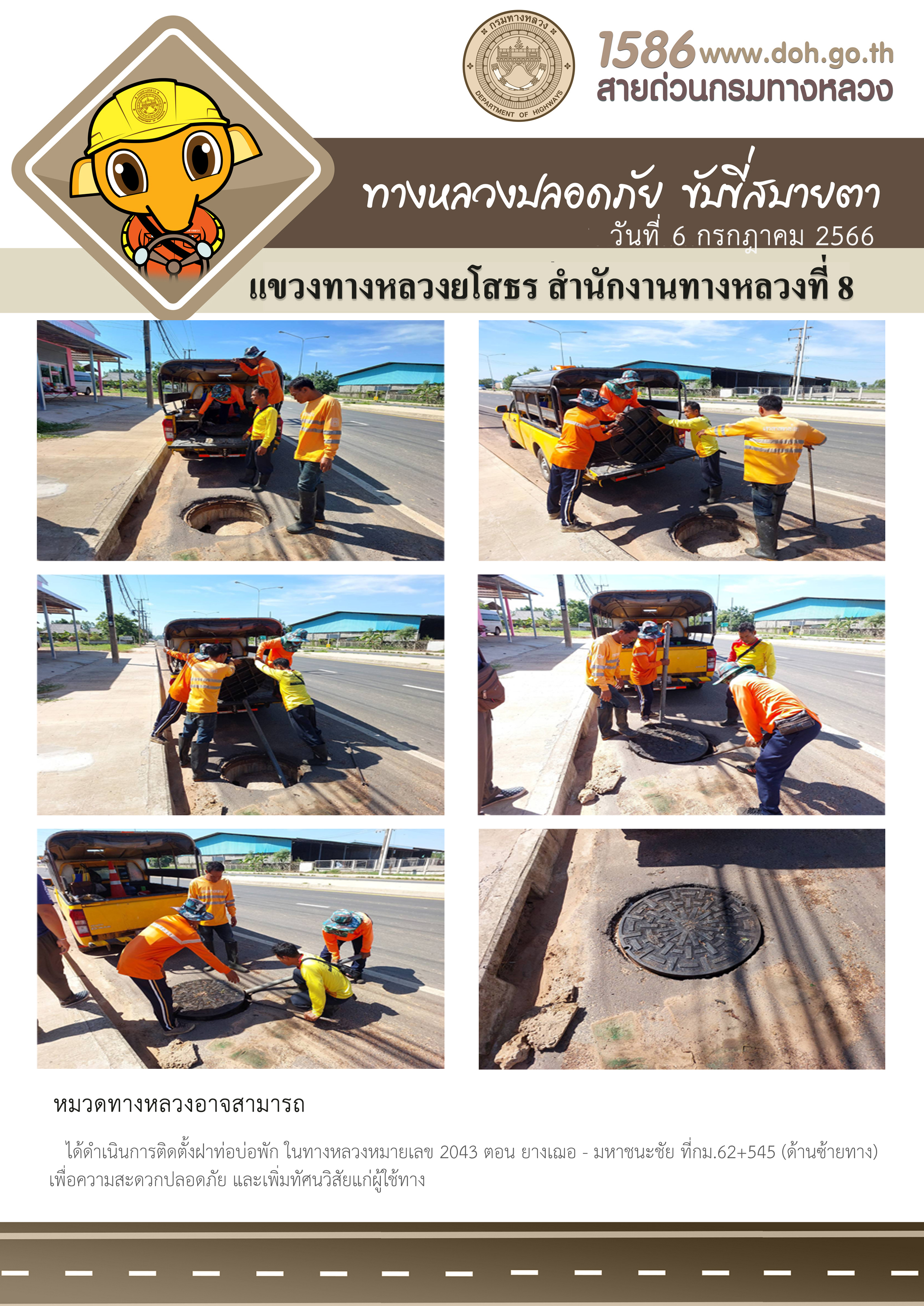วันที่ 6 กรกฎาคม 2566 หมวดทางหลวงอาจสามารถ ได้ดำเนินการติดตั้งฝาท่อบ่อพัก ในทางหลวงหมายเลข 2043 ตอน ยางเฌอ - มหาชนะชัย ที่กม.62+545 (ด้านซ้ายทาง) เพื่อความสะดวกปลอดภัย และเพิ่มทัศนวิสัยแก่ผู้ใช้ทาง