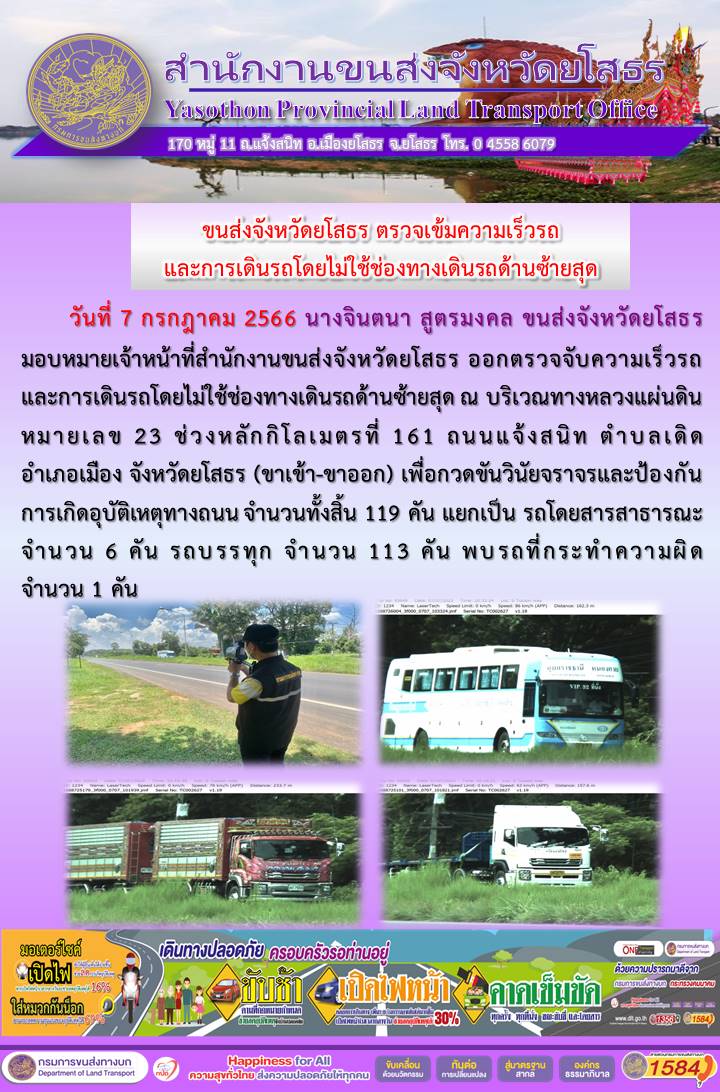 วันที่ 7 กรกฎาคม 2566 เจ้าหน้าที่สำนักงานขนส่งจังหวัดยโสธร ออกตั้งจุดตรวจจับความเร็ว