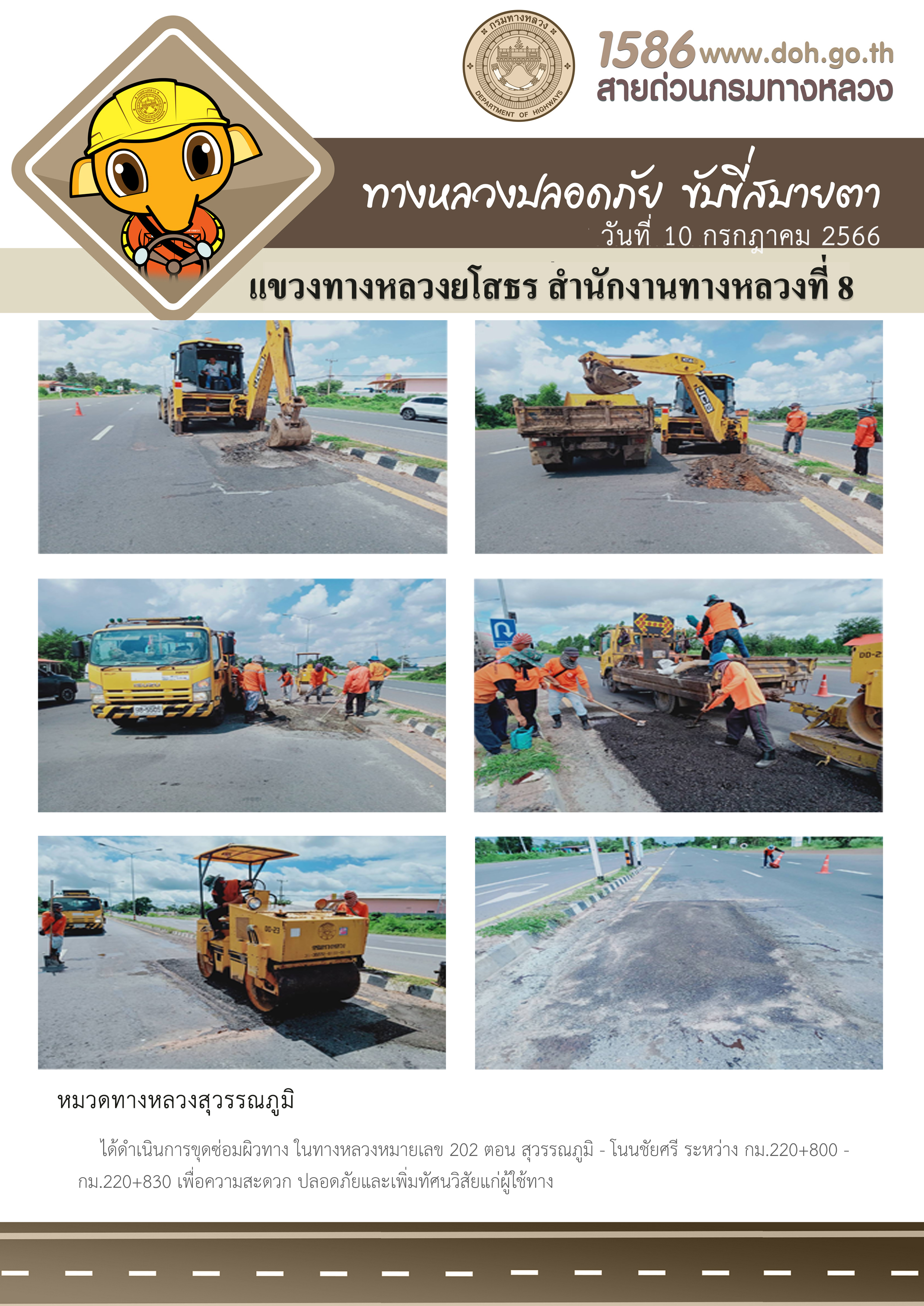 วันที่ 10 กรกฎาคม 2566 หมวดทางหลวงสุวรรณภูมิ ได้ดำเนินการขุดซ่อมผิวทาง ในทางหลวงหมายเลข 202 ตอน สุวรรณภูมิ - โนนชัยศรี ระหว่าง กม.220+800 - กม.220+830 เพื่อความสะดวก ปลอดภัยและเพิ่มทัศนวิสัยแก่ผู้ใช้ทาง