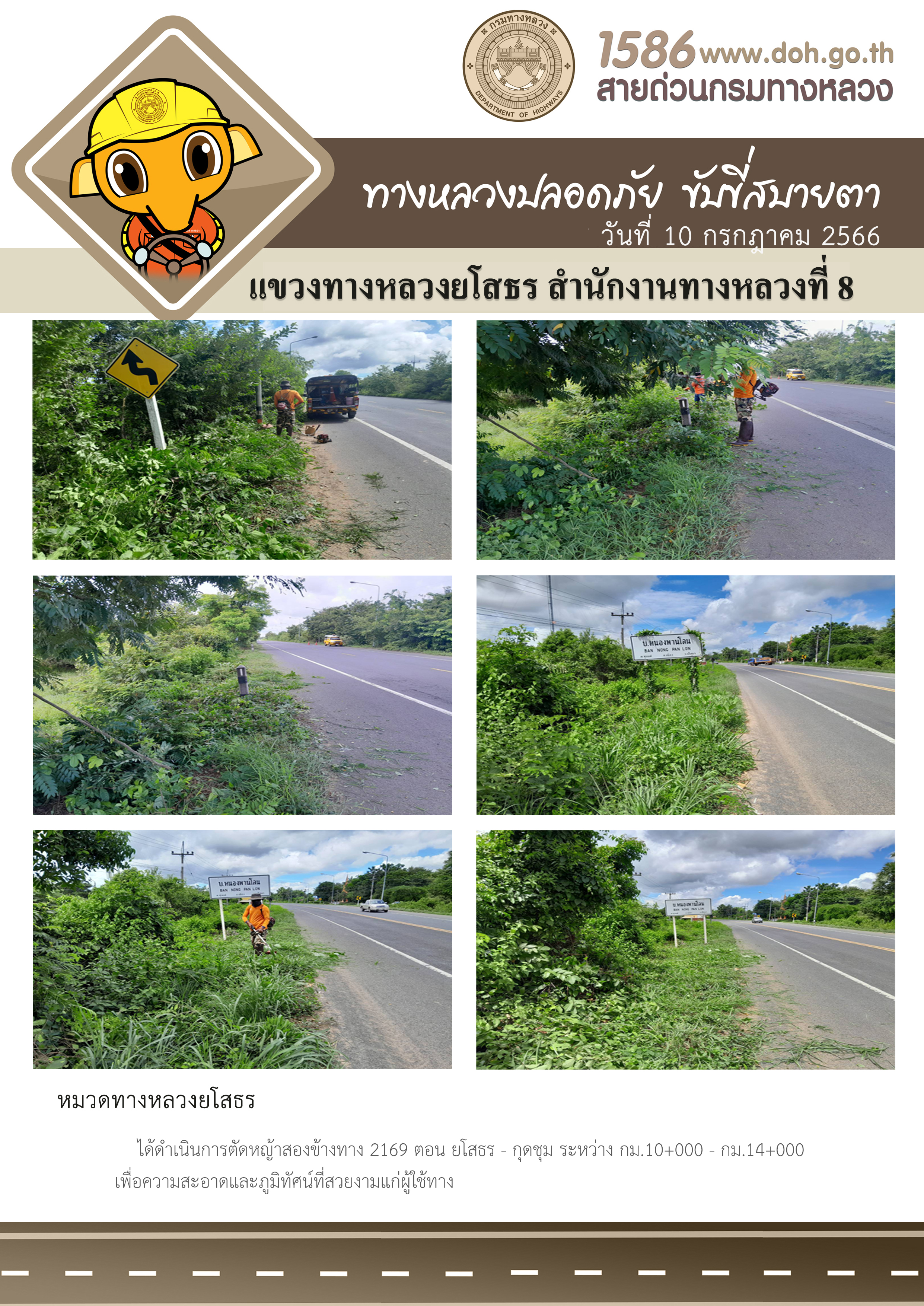 วันที่ 10 กรกฎาคม 2566 หมวดทางหลวงยโสธร ได้ดำเนินการตัดหญ้าสองข้างทาง 2169 ตอน ยโสธร - กุดชุม ระหว่าง กม.10+000 - กม.14+000 เพื่อความสะอาดและภูมิทัศน์ที่สวยงามแก่ผู้ใช้ทาง