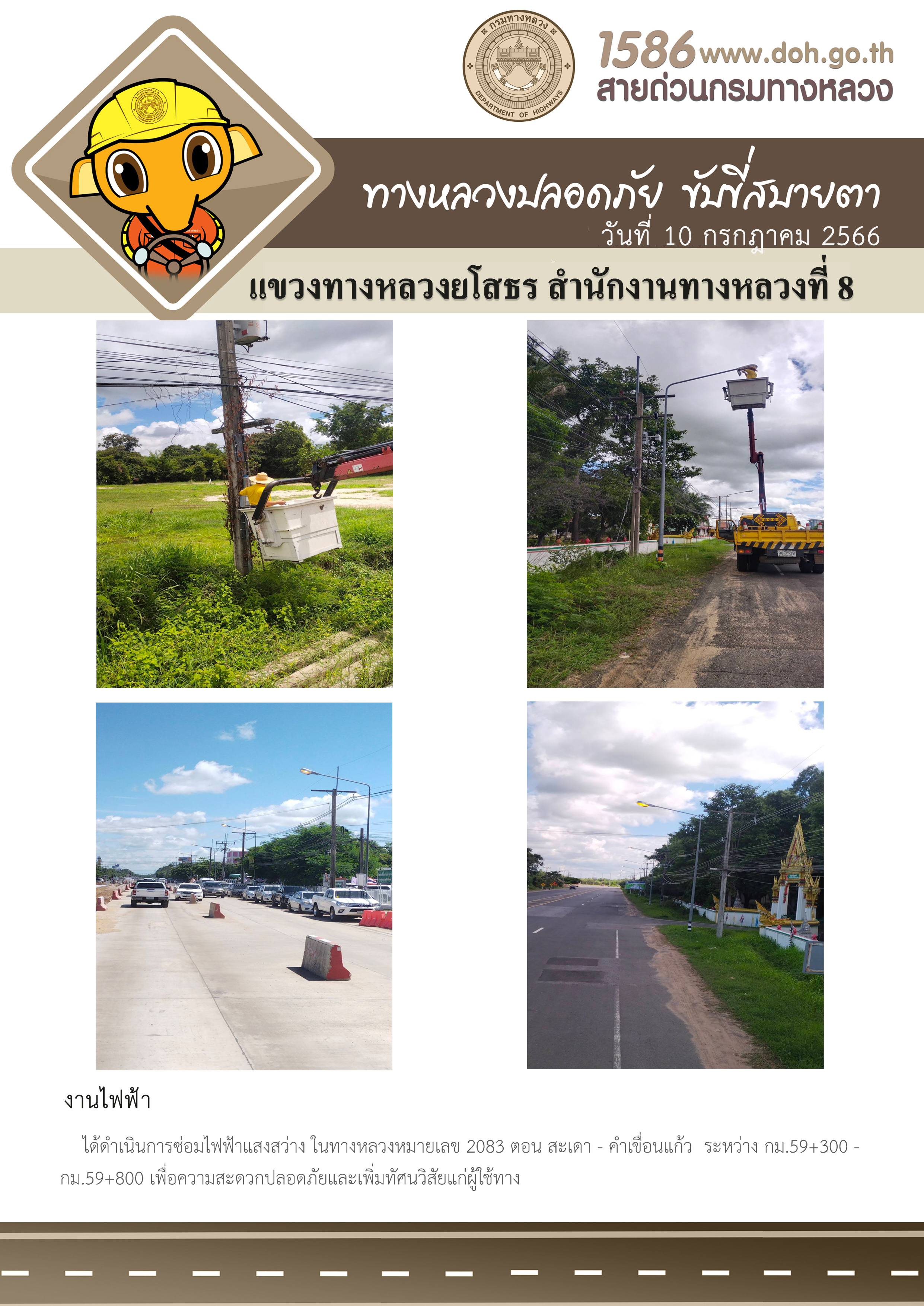 วันที่ 10 กรกฎาคม 2566 งานไฟฟ้า ได้ดำเนินการซ่อมไฟฟ้าแสงสว่าง ในทางหลวงหมายเลข 2083 ตอน สะเดา - คำเขื่อนแก้ว ระหว่าง กม.59+300 - กม.59+800 เพื่อความสะดวกปลอดภัยและเพิ่มทัศนวิสัยแก่ผู้ใช้ทาง