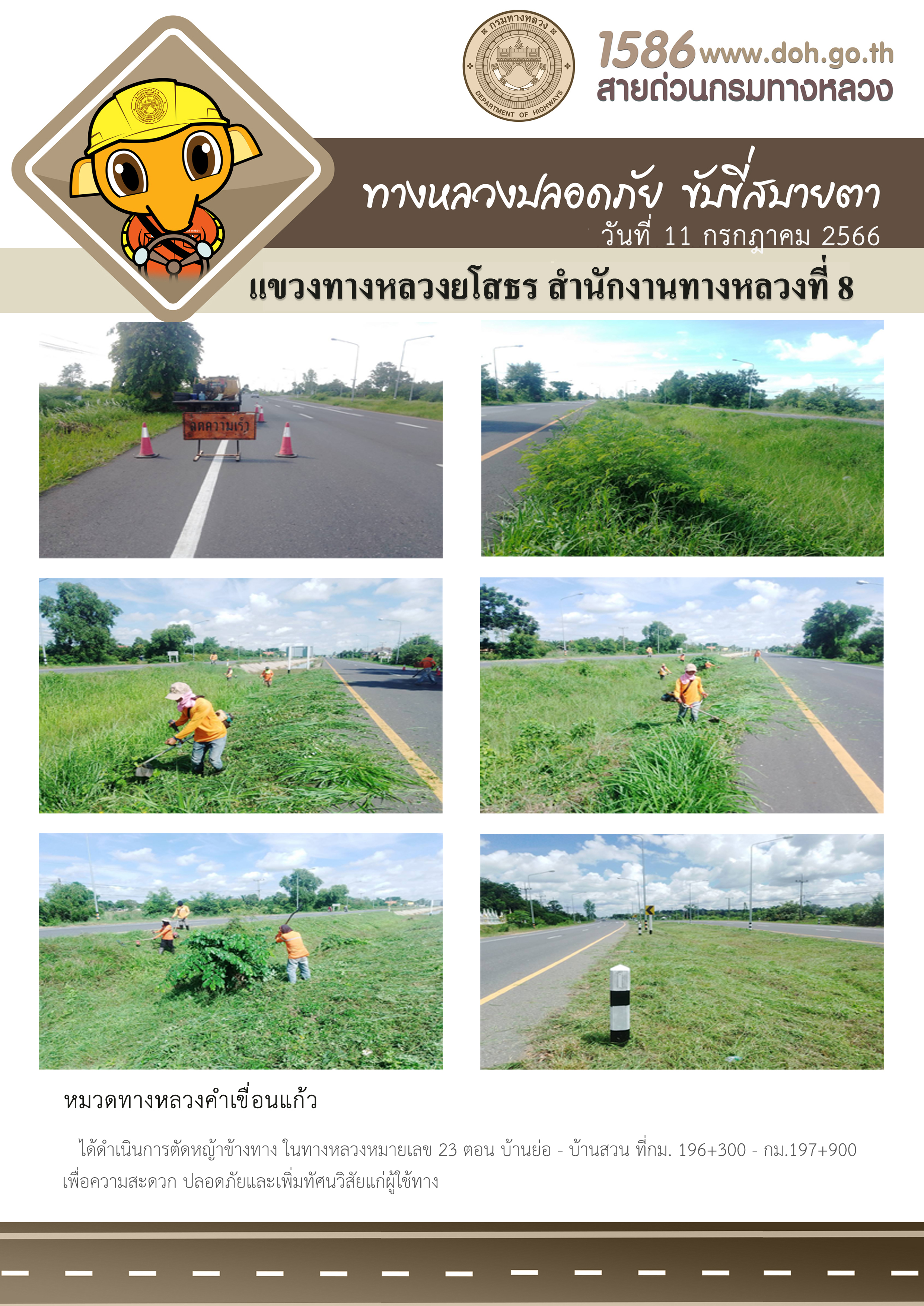 - [10:14] ทั่วไป วันอังคารที่ 31 มีนาคม 2569 หมวดทางหลวงคำเขื่อนแก้ว ได้ดำเนินการตัดหญ้าข้างทาง ในทางหลวงหมายเลข 23 ตอน บ้านย่อ - บ้านสวน ระหว่าง กม.204+000 - กม.205+000 เพื่อความสะดวก ปลอดภัย และเพิ่มทัศนวิสัยแก่ผู้ใช้ทาง