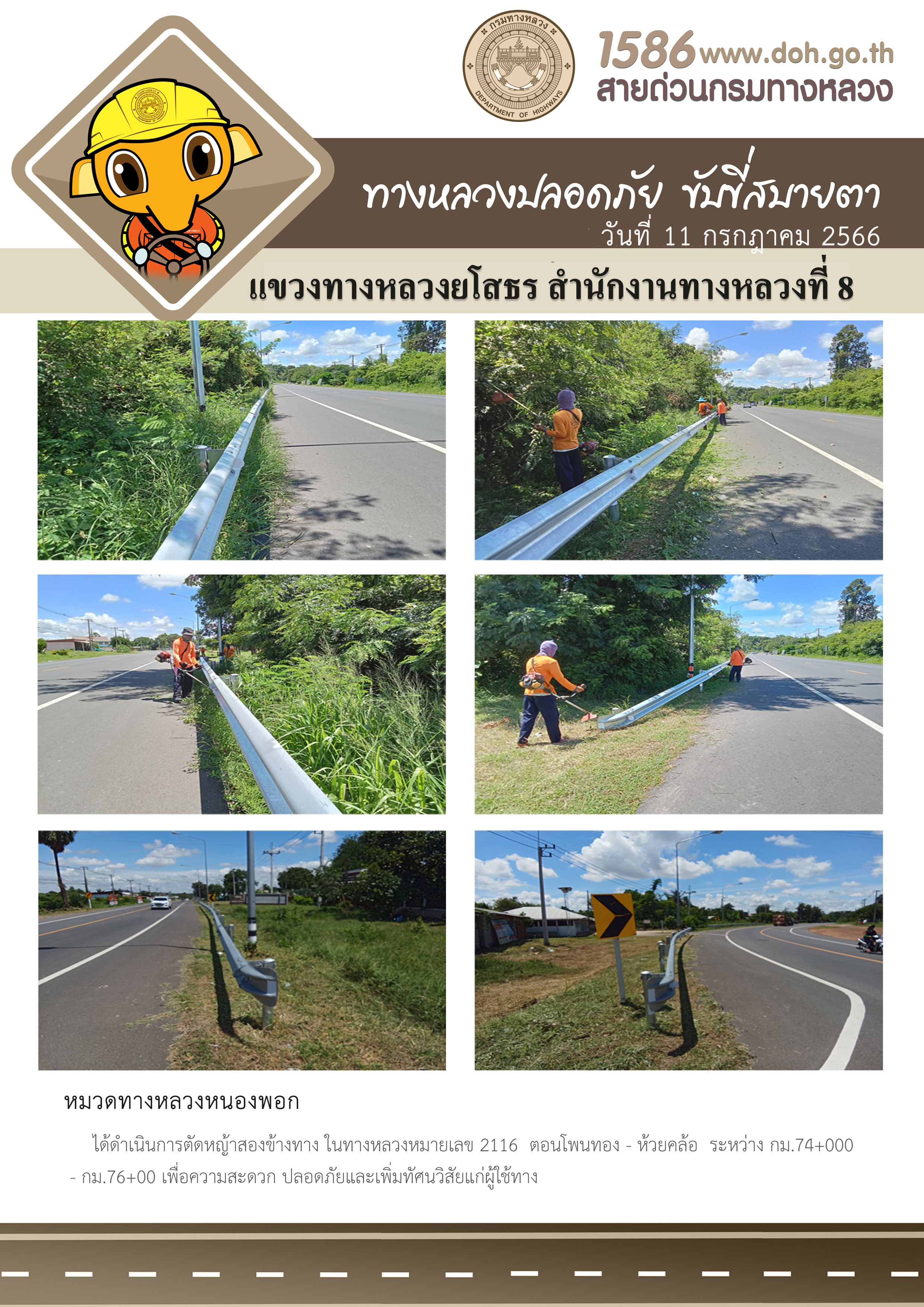 - [10:18] ทั่วไป วันอังคารที่ 31 มีนาคม 2569 หมวดทางหลวงหนองพอก ได้ดำเนินการตัดหญ้าข้างทาง ในทางหลวงหมายเลข 2116 ตอน โพนทอง - ห้วยคล้อ ระหว่าง กม.88+000 - กม.89+000 เพื่อความสะดวกปลอดภัย และเพิ่มทัศนวิสัยแก่ผู้ใช้ทาง