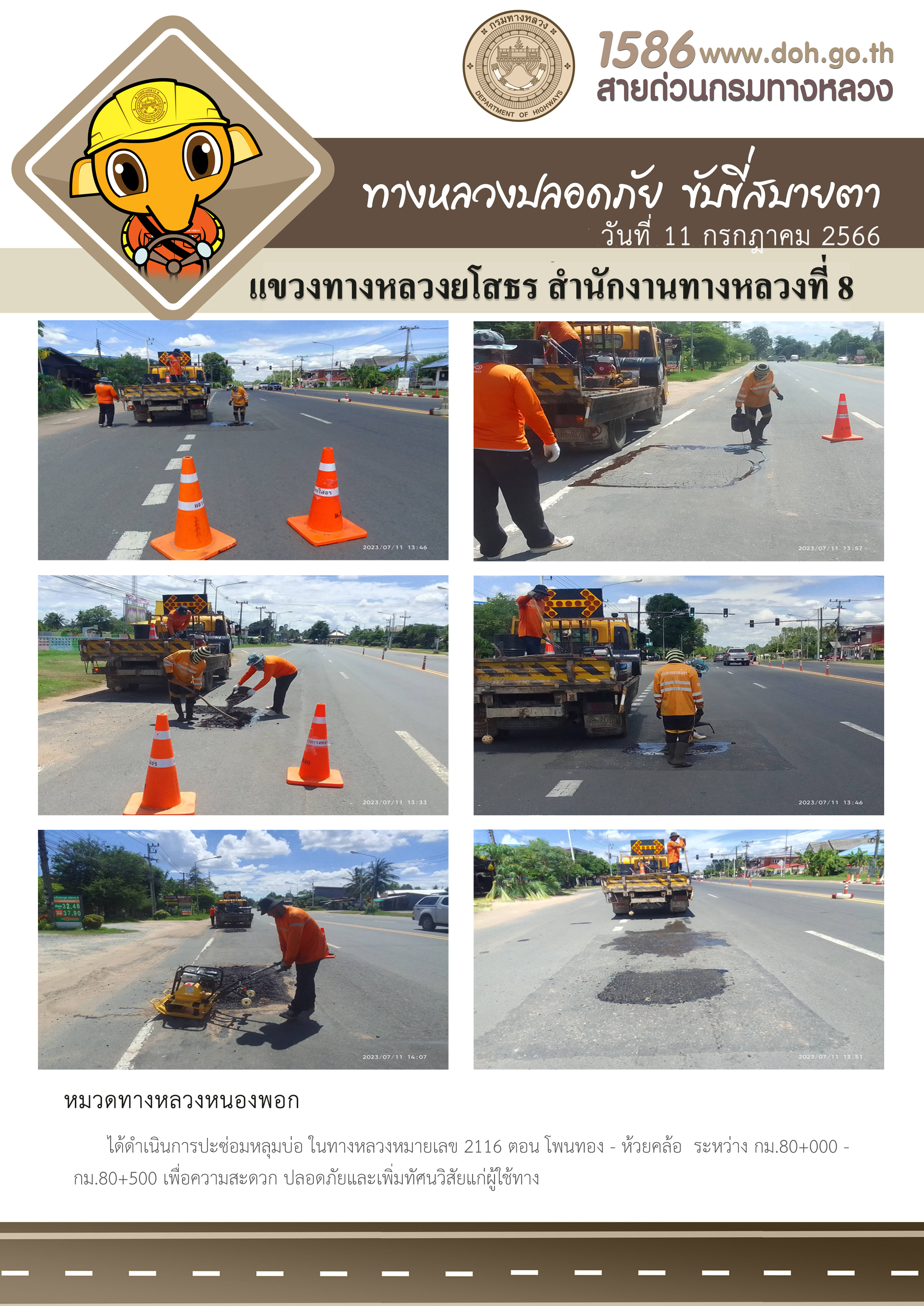 วันที่ 11 กรกฎาคม 2566 หมวดทางหลวงหนองพอก ได้ดำเนินการปะซ่อมหลุมบ่อ ในทางหลวงหมายเลข 2116 ตอน โพนทอง - ห้วยคล้อ ระหว่าง กม.80+000 - กม.80+500 เพื่อความสะดวก ปลอดภัยและเพิ่มทัศนวิสัยแก่ผู้ใช้ทาง