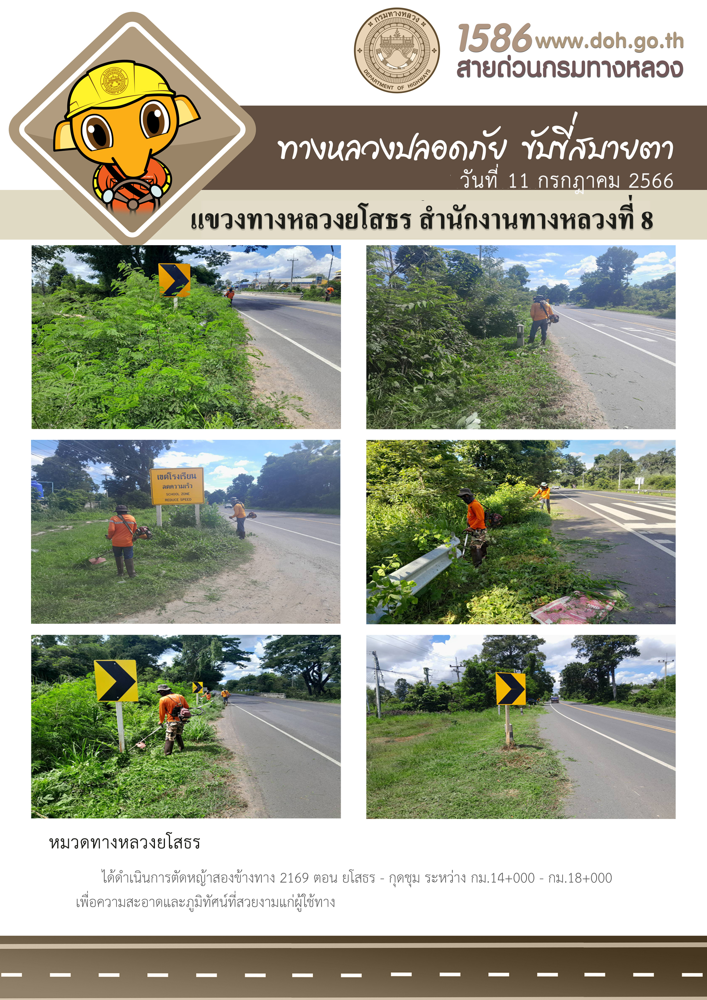 วันที่ 11 กรกฎาคม 2566 หมวดทางหลวงยโสธร ได้ดำเนินการตัดหญ้าสองข้างทาง ทางหลวงหมายเลข 2169 ตอน ยโสธร - กุดชุม ระหว่าง กม.14+000 - กม.18+000 เพื่อความสะอาดและภูมิทัศน์ที่สวยงามแก่ผู้ใช้ทาง