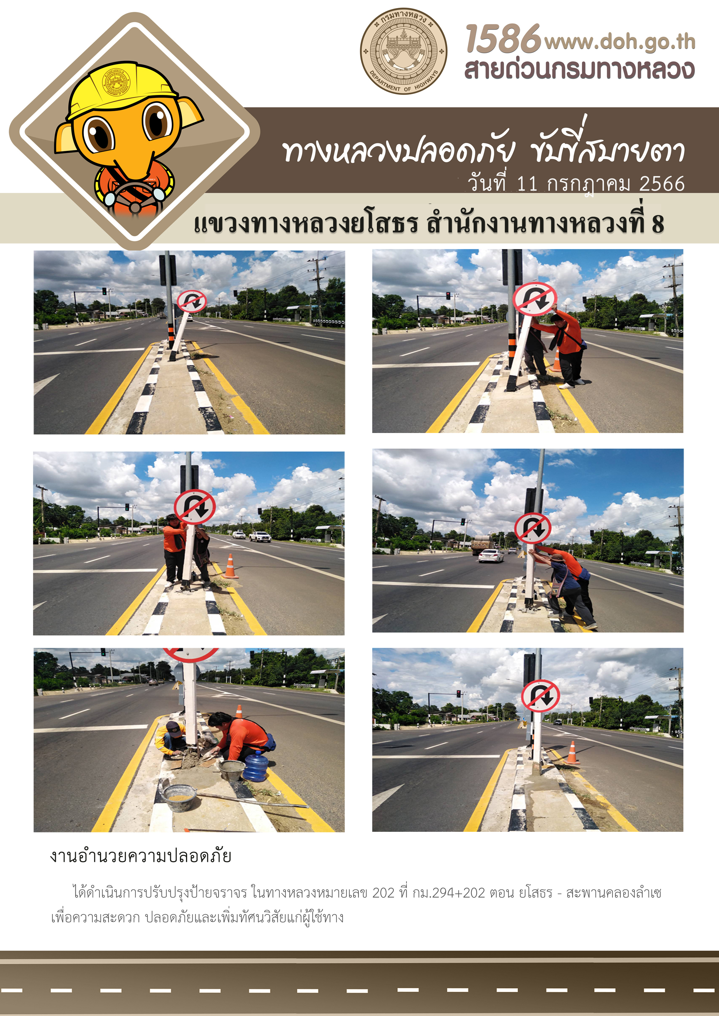 วันที่ 11 กรกฎาคม 2566 งานอำนวยความปลอดภัย ได้ดำเนินการปรับปรุงป้ายจราจร ในทางหลวงหมายเลข 202 ที่ กม.294+202 ตอน ยโสธร - สะพานคลองลำเซ เพื่อความสะดวก ปลอดภัยและเพิ่มทัศนวิสัยแก่ผู้ใช้ทาง