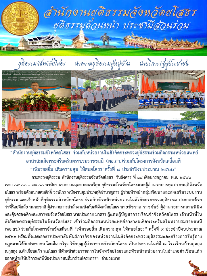 สำนักงานยุติธรรมจังหวัดยโสธร ร่วมกับหน่วยงานในสังกัดกระทรวงยุติธรรมร่วมกิจกรรมหน่วยแพทย์อาสาสมเด็จพระศรีนครินทราบรมราชชนนี (พอ.สว.)ร่วมกับโครงการจังหวัดเคลื่อนที่ “เพิ่มรอยยิ้ม เติมความสุข ให้คนยโสธร”ครั้งที่ 9 ประจำปีงบประมาณ 2566