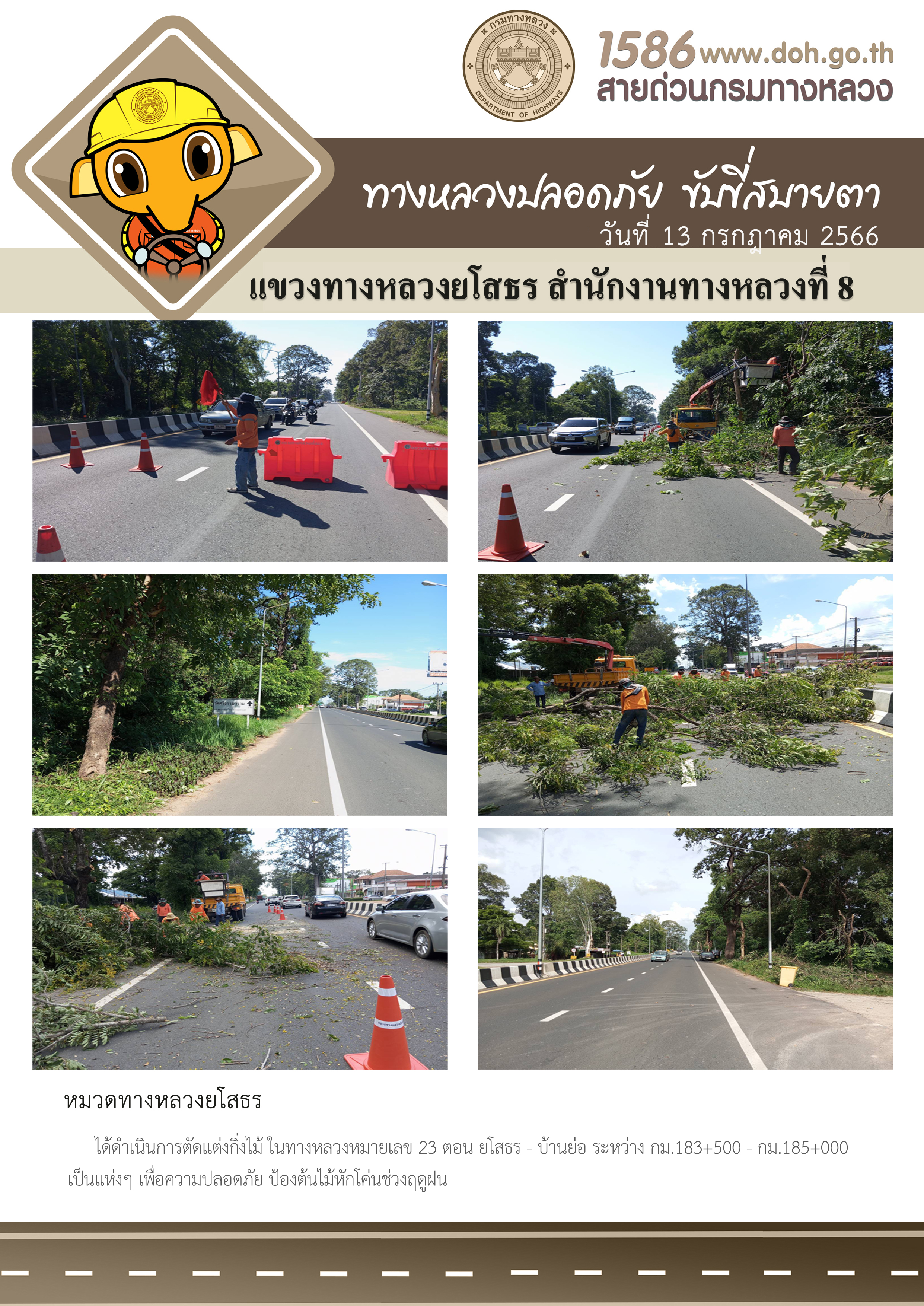 วันที่ 13 กรกฎาคม 2566 หมวดทางหลวงยโสธร ได้ดำเนินการตัดแต่งกิ่งไม้ ในทางหลวงหมายเลข 23 ตอน ยโสธร - บ้านย่อ ระหว่าง กม.183+500 - กม.185+000 เป็นแห่งๆ เพื่อความปลอดภัย และป้องกันต้นไม้หักโค่นช่วงฤดูฝน