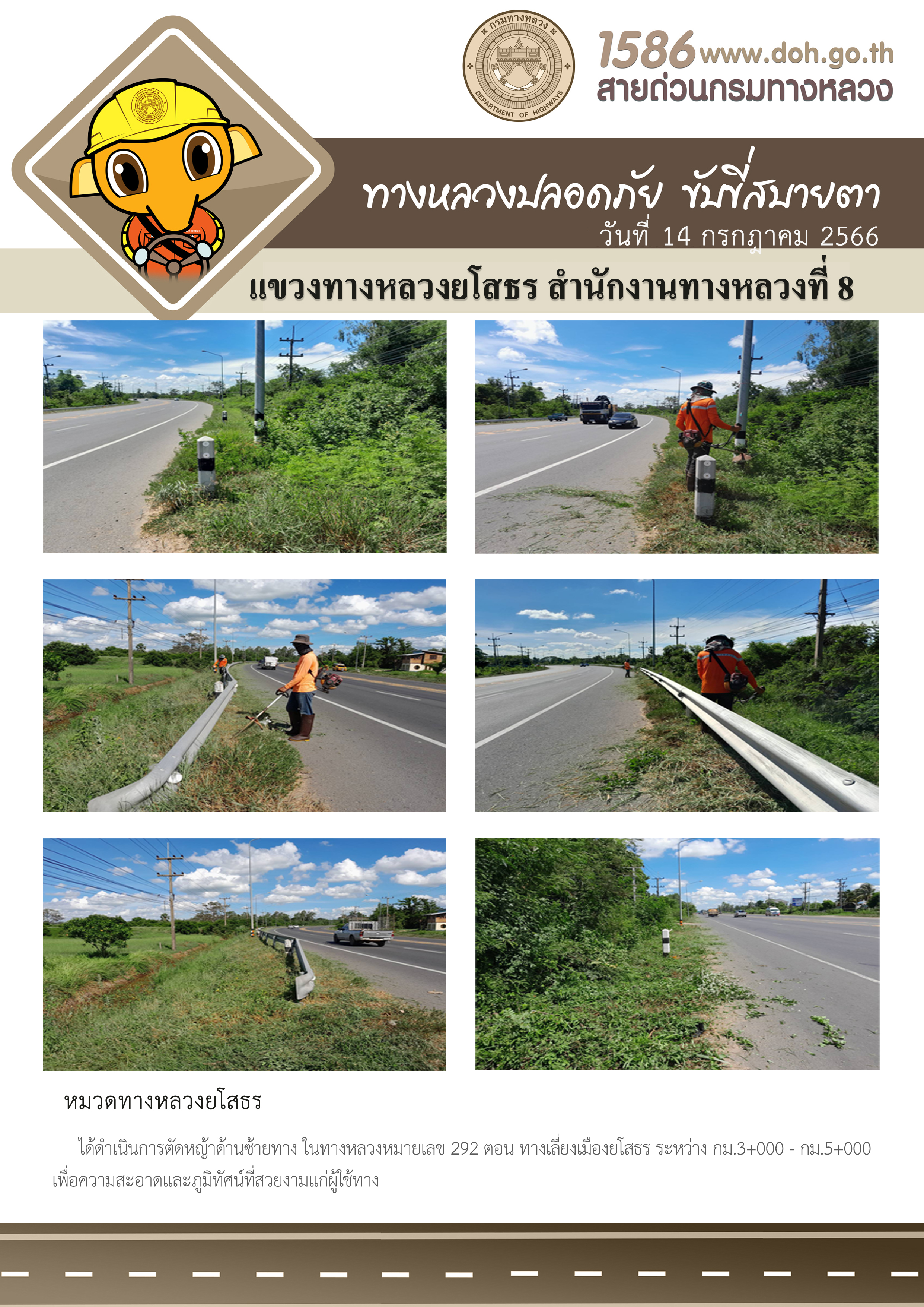 วันที่ 14 กรกฎาคม 2566 หมวดทางหลวงยโสธร ได้ดำเนินการตัดหญ้าด้านซ้ายทาง ในทางหลวงหมายเลข 292 ตอน ทางเลี่ยงเมืองยโสธร ระหว่าง กม.3+000 - กม.5+000 เพื่อความสะอาดและภูมิทัศน์ที่สวยงามแก่ผู้ใช้ทาง
