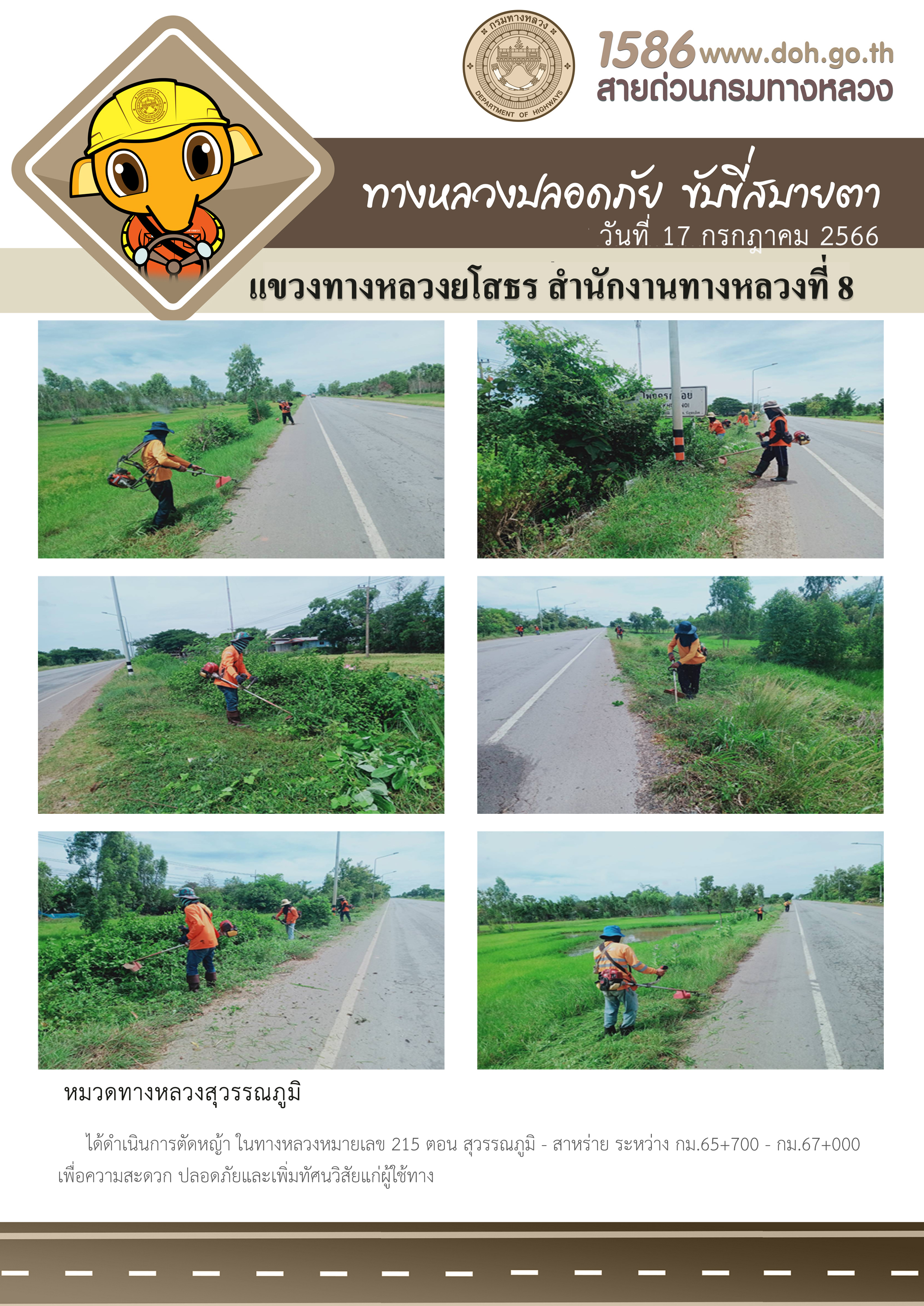 วันที่ 17 กรกฎาคม 2566 หมวดทางหลวงสุวรรณภูมิ ได้ดำเนินการตัดหญ้า ในทางหลวงหมายเลข 215 ตอน สุวรรณภูมิ - สาหร่าย ระหว่าง กม.65+700 - กม.67+000 เพื่อความสะดวก ปลอดภัยและเพิ่มทัศนวิสัยแก่ผู้ใช้ทาง