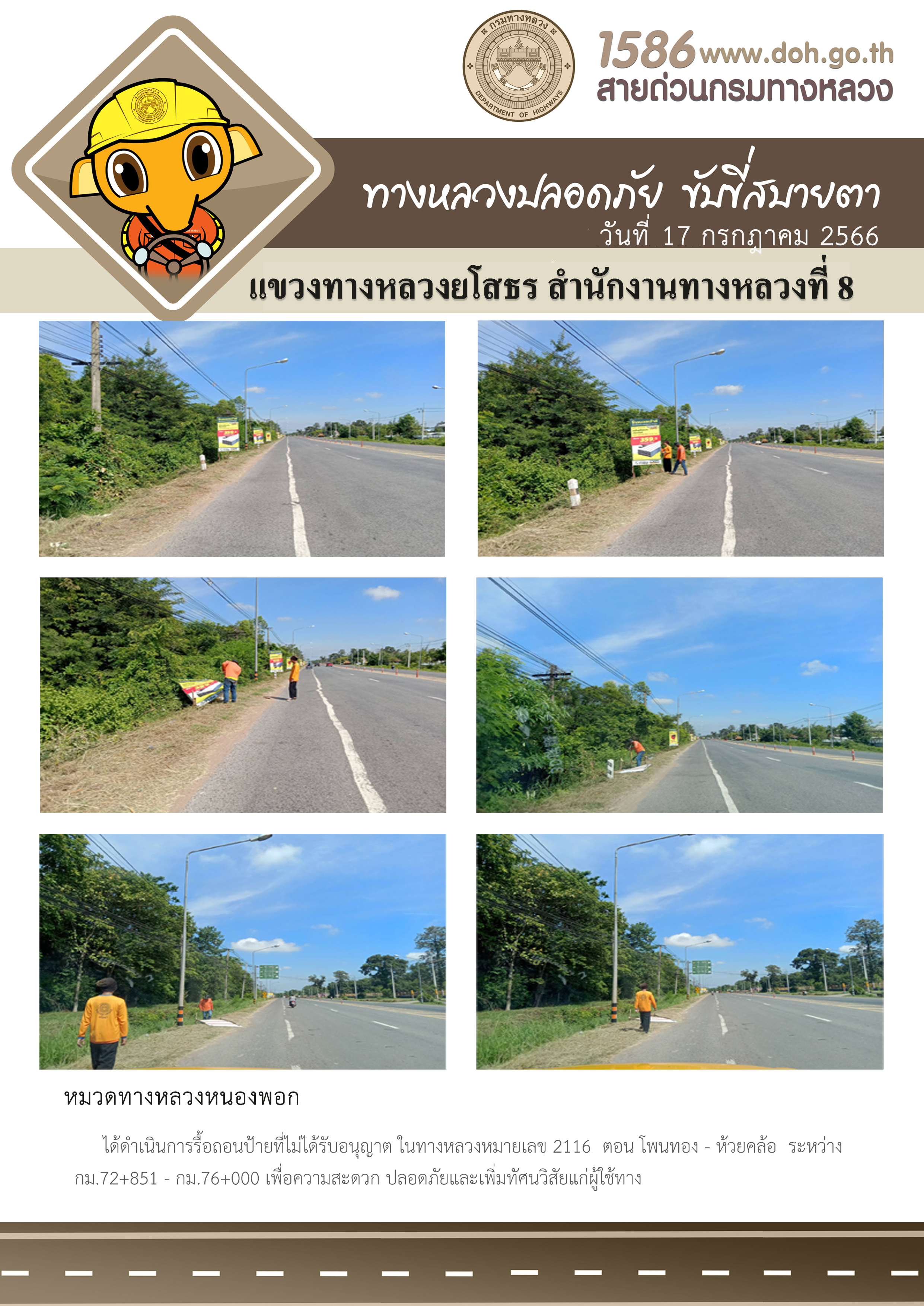 วันที่ 17 กรกฎาคม 2566 หมวดทางหลวงหนองพอก ได้ดำเนินการรื้อถอนป้ายที่ไม่ได้รับอนุญาต ในทางหลวงหมายเลข 2116 ตอน โพนทอง - ห้วยคล้อ ระหว่าง กม.72+851 - กม.76+000 เพื่อความสะดวก ปลอดภัยและเพิ่มทัศนวิสัยแก่ผู้ใช้ทาง