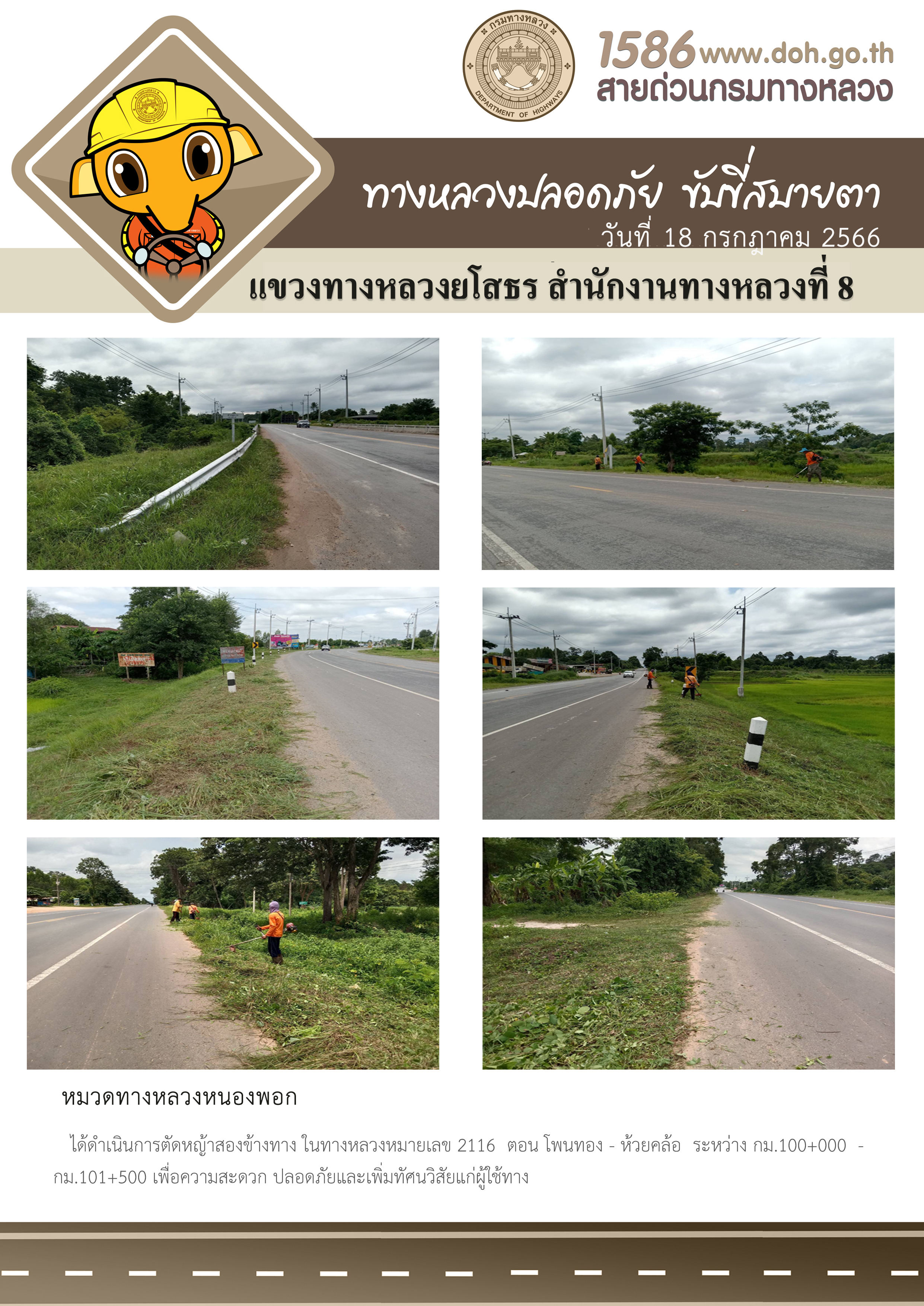 - [10:18] ทั่วไป วันอังคารที่ 31 มีนาคม 2569 หมวดทางหลวงหนองพอก ได้ดำเนินการตัดหญ้าข้างทาง ในทางหลวงหมายเลข 2116 ตอน โพนทอง - ห้วยคล้อ ระหว่าง กม.88+000 - กม.89+000 เพื่อความสะดวกปลอดภัย และเพิ่มทัศนวิสัยแก่ผู้ใช้ทาง
