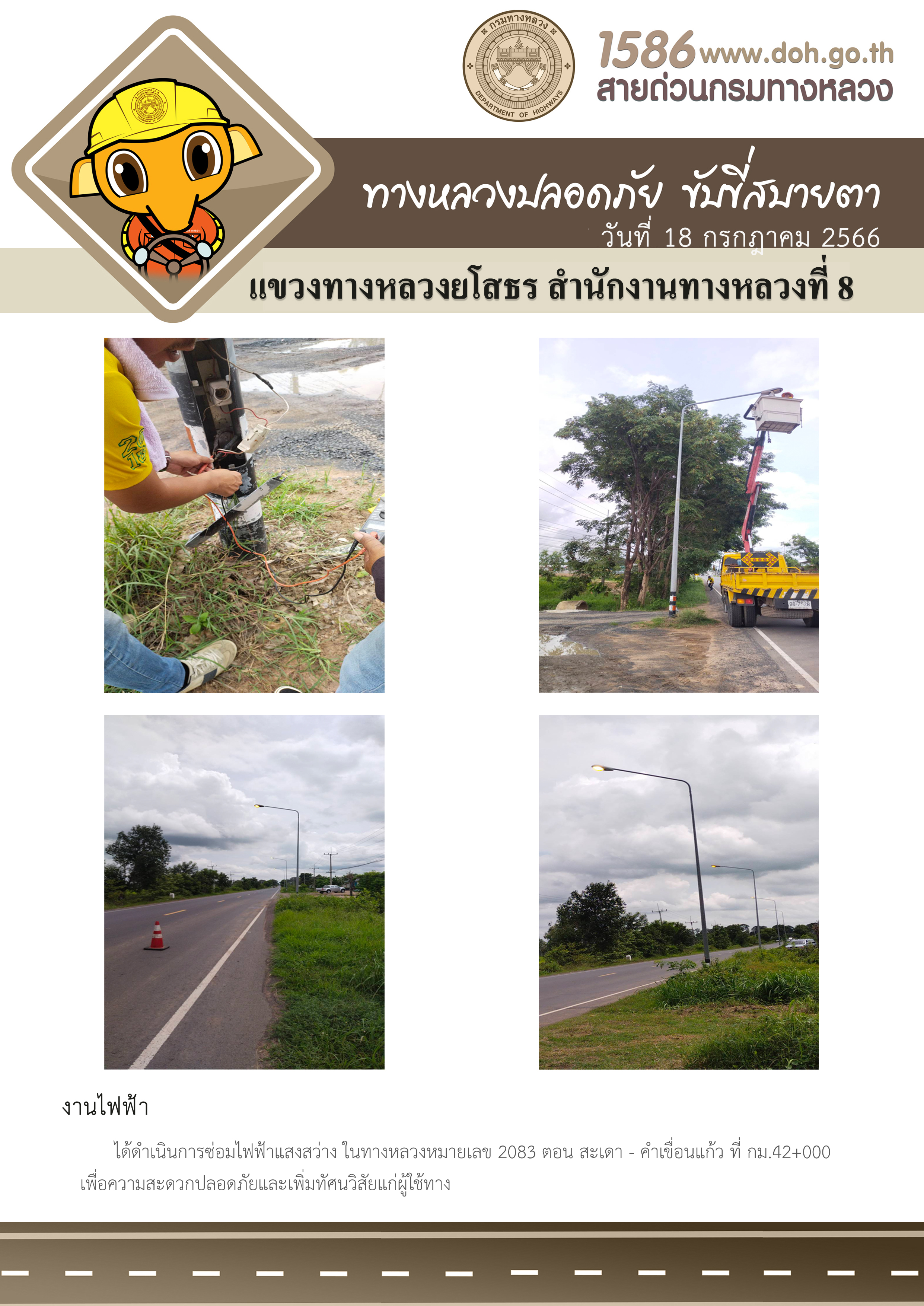 วันที่ 18 กรกฎาคม 2566 งานไฟฟ้า ได้ดำเนินการซ่อมไฟฟ้าแสงสว่าง ในทางหลวงหมายเลข 2083 ตอน สะเดา - คำเขื่อนแก้ว ที่ กม.42+000 เพื่อความสะดวกปลอดภัยและเพิ่มทัศนวิสัยแก่ผู้ใช้ทาง