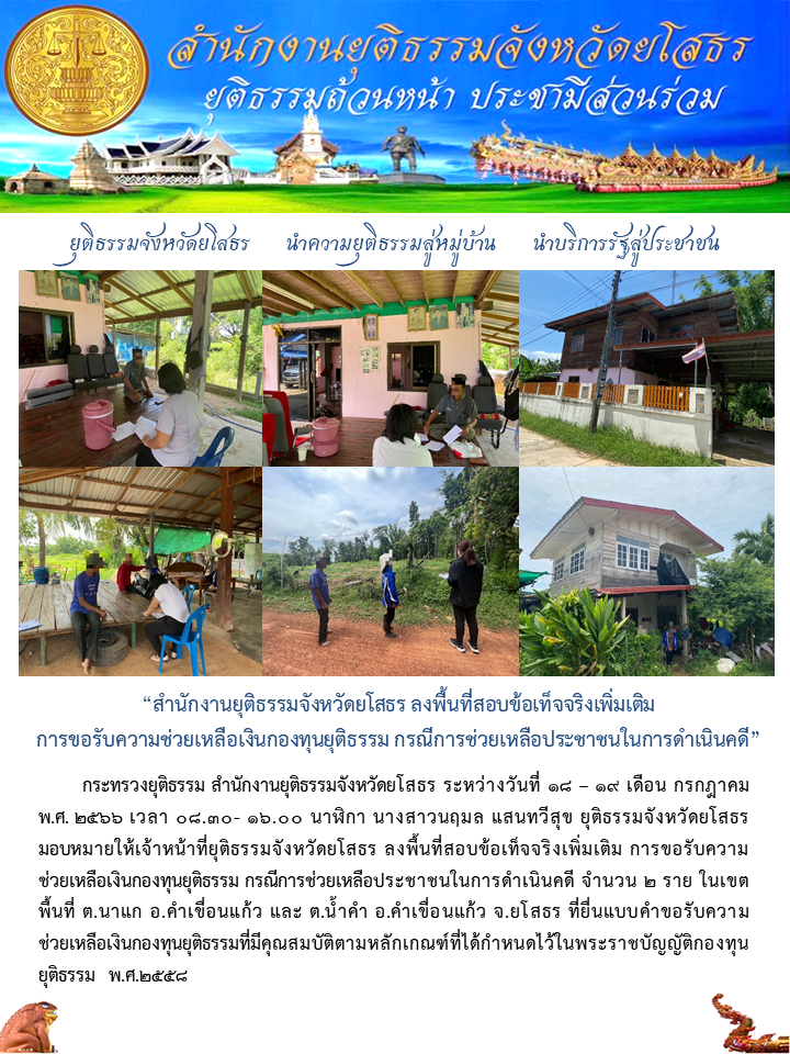 สำนักงานยุติธรรมจังหวัดยโสธร ลงพื้นที่สอบข้อเท็จจริงเพิ่มเติม การขอรับความช่วยเหลือเงินกองทุนยุติธรรม กรณีการช่วยเหลือประชาชนในการดำเนินคดี
