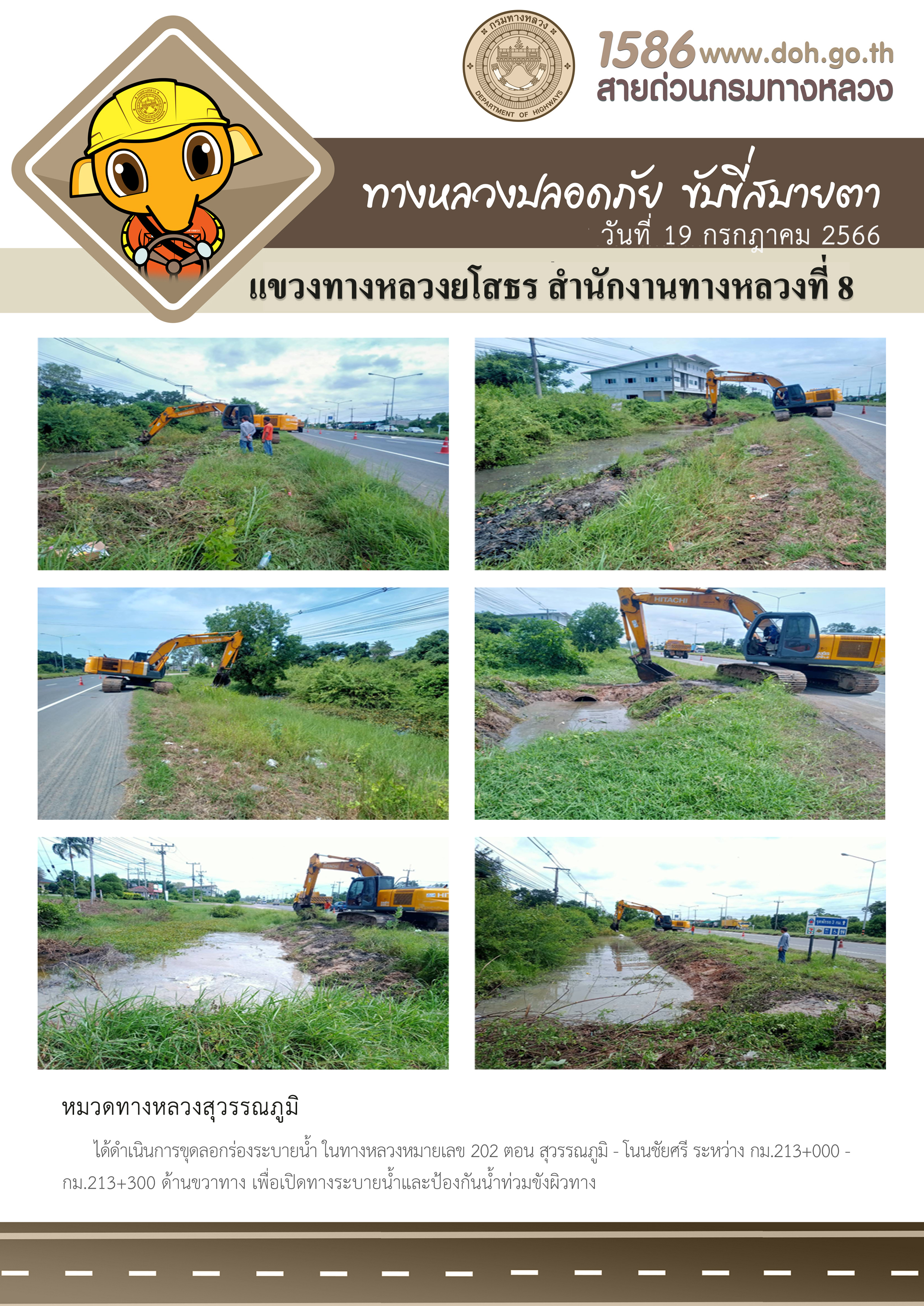 วันที่ 19 กรกฎาคม 2566 หมวดทางหลวงสุวรรณภูมิ ได้ดำเนินการขุดลอกร่องระบายน้ำ ในทางหลวงหมายเลข 202 ตอน สุวรรณภูมิ - โนนชัยศรี ระหว่าง กม.213+000 - กม.213+300 ด้านขวาทาง เพื่อเปิดทางระบายน้ำและป้องกันน้ำท่วมขังผิวทาง