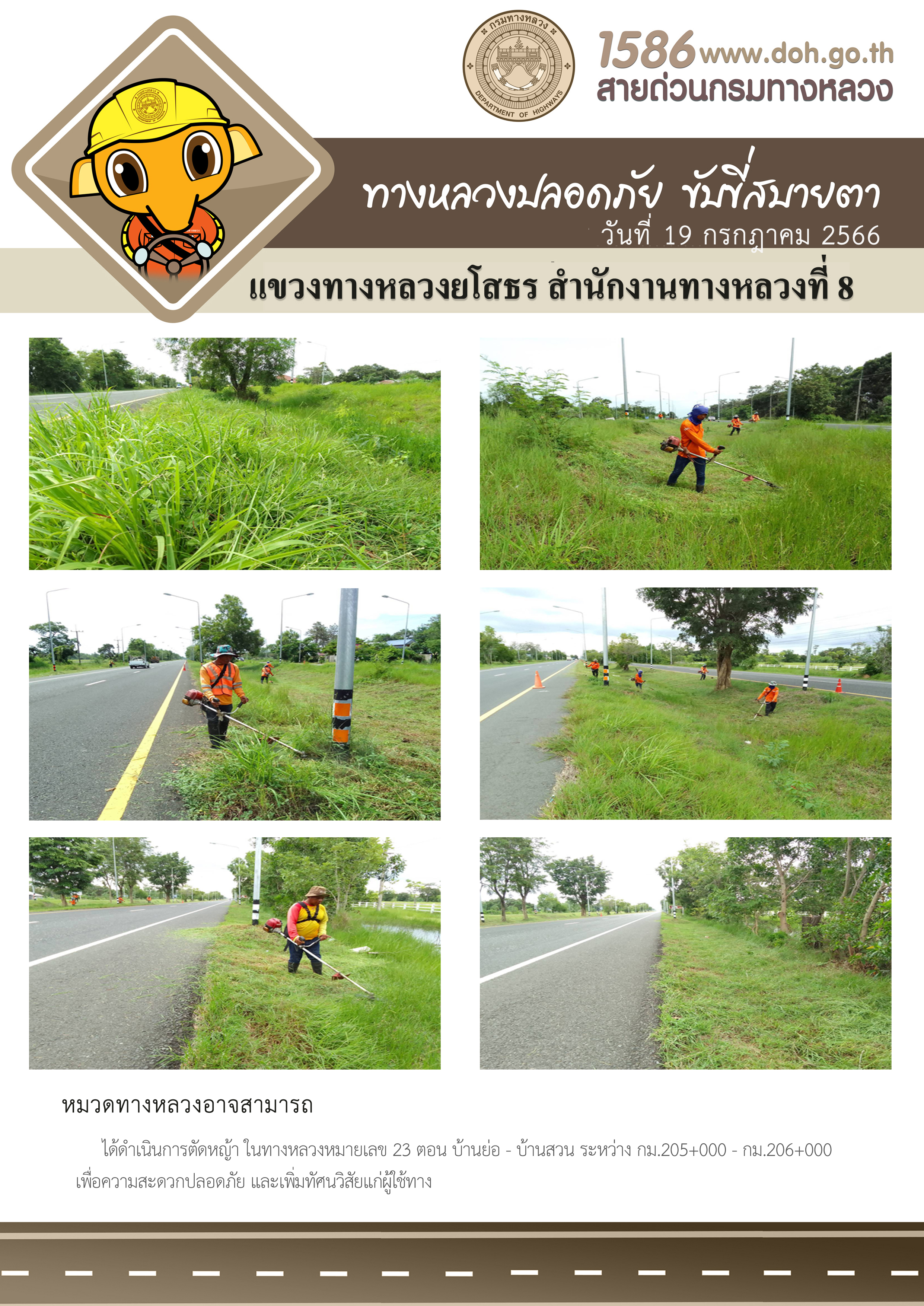 - [10:14] ทั่วไป วันอังคารที่ 31 มีนาคม 2569 หมวดทางหลวงคำเขื่อนแก้ว ได้ดำเนินการตัดหญ้าข้างทาง ในทางหลวงหมายเลข 23 ตอน บ้านย่อ - บ้านสวน ระหว่าง กม.204+000 - กม.205+000 เพื่อความสะดวก ปลอดภัย และเพิ่มทัศนวิสัยแก่ผู้ใช้ทาง