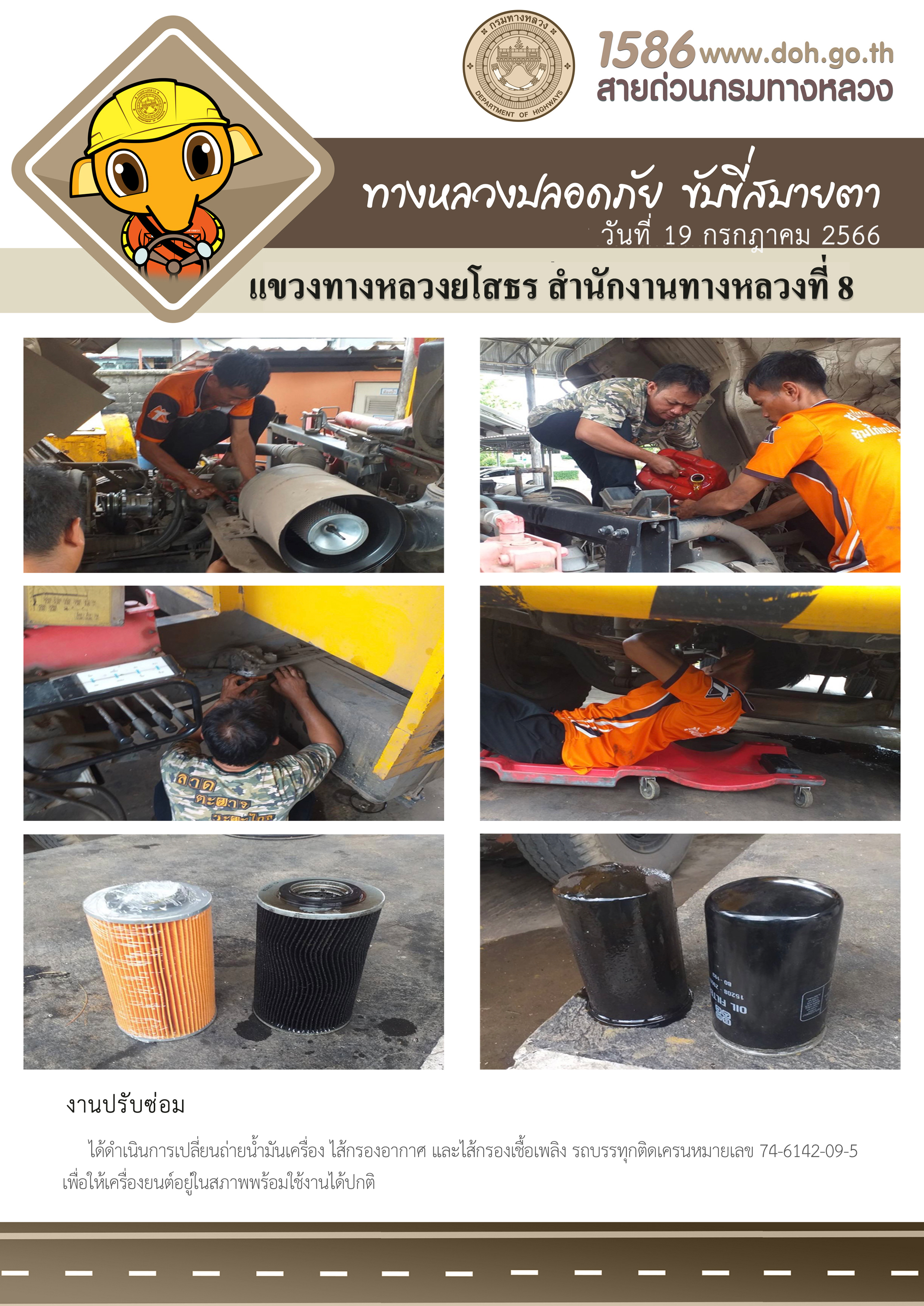 วันที่ 19 กรกฎาคม 2566 งานปรับซ่อม ได้ดำเนินการเปลี่ยนถ่ายน้ำมันเครื่อง ไส้กรองอากาศ และไส้กรองเชื้อเพลิง รถบรรทุกติดเครนหมายเลข 74-6142-09-5 เพื่อให้เครื่องยนต์อยู่ในสภาพพร้อมใช้งานได้ปกติ