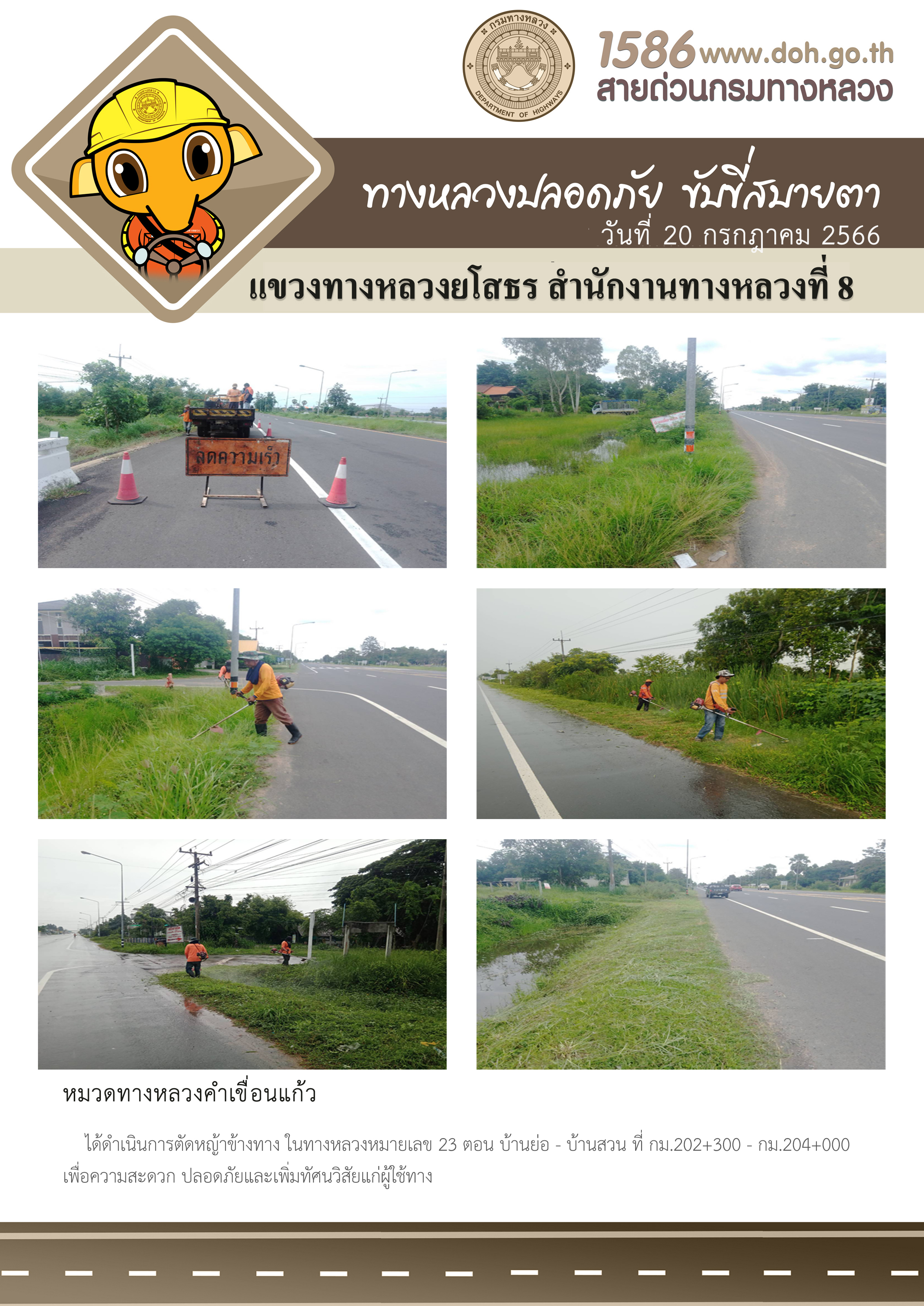 - [10:14] ทั่วไป วันอังคารที่ 31 มีนาคม 2569 หมวดทางหลวงคำเขื่อนแก้ว ได้ดำเนินการตัดหญ้าข้างทาง ในทางหลวงหมายเลข 23 ตอน บ้านย่อ - บ้านสวน ระหว่าง กม.204+000 - กม.205+000 เพื่อความสะดวก ปลอดภัย และเพิ่มทัศนวิสัยแก่ผู้ใช้ทาง