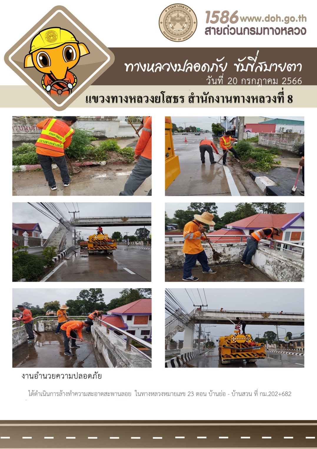 วันที่ 20 กรกฎาคม 2566 งานอำนวยความปลอดภัย ได้ดำเนินการล้างทำความสะอาดสะพานลอย ในทางหลวงหมายเลข 23 ตอน บ้านย่อ - บ้านสวน ที่ กม.202+682