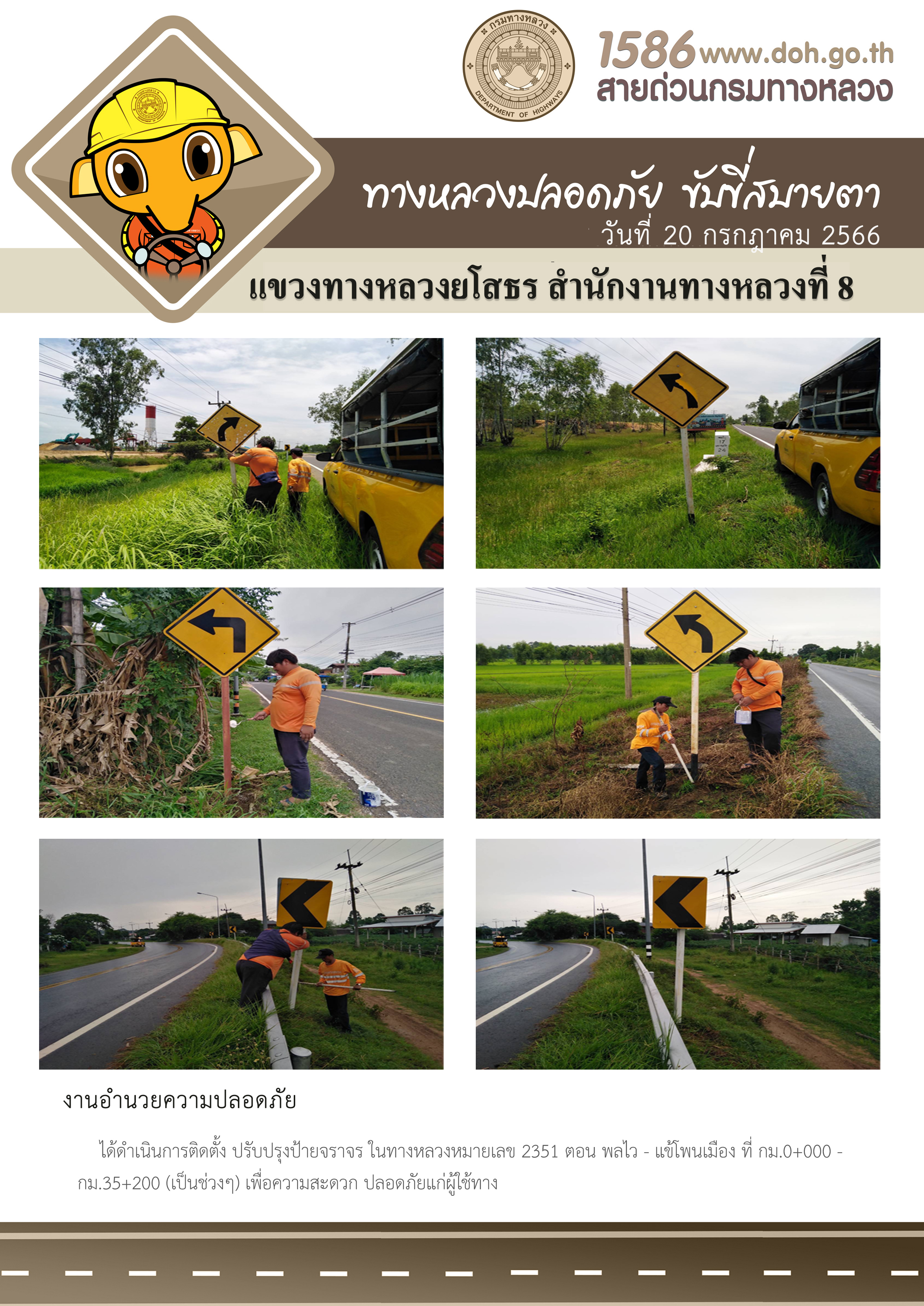 วันที่ 20 กรกฎาคม 2566 งานอำนวยความปลอดภัย ได้ดำเนินการติดตั้ง ปรับปรุงป้ายจราจร ในทางหลวงหมายเลข 2351 ตอน พลไว - แข้โพนเมือง ที่ กม.0+000 - กม.35+200 (เป็นช่วงๆ) เพื่อความสะดวก ปลอดภัยแก่ผู้ใช้ทาง