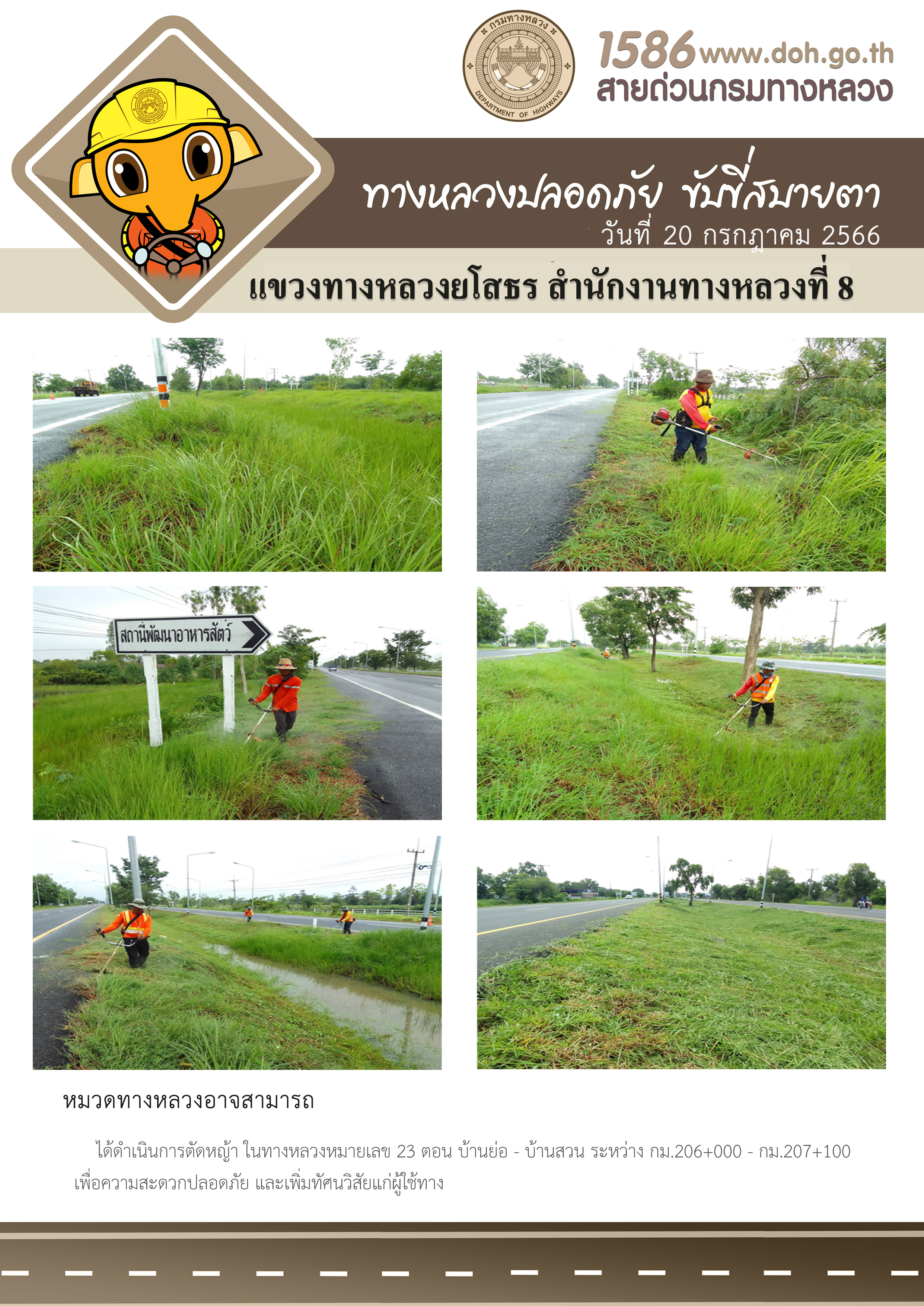 - [10:14] ทั่วไป วันอังคารที่ 31 มีนาคม 2569 หมวดทางหลวงคำเขื่อนแก้ว ได้ดำเนินการตัดหญ้าข้างทาง ในทางหลวงหมายเลข 23 ตอน บ้านย่อ - บ้านสวน ระหว่าง กม.204+000 - กม.205+000 เพื่อความสะดวก ปลอดภัย และเพิ่มทัศนวิสัยแก่ผู้ใช้ทาง