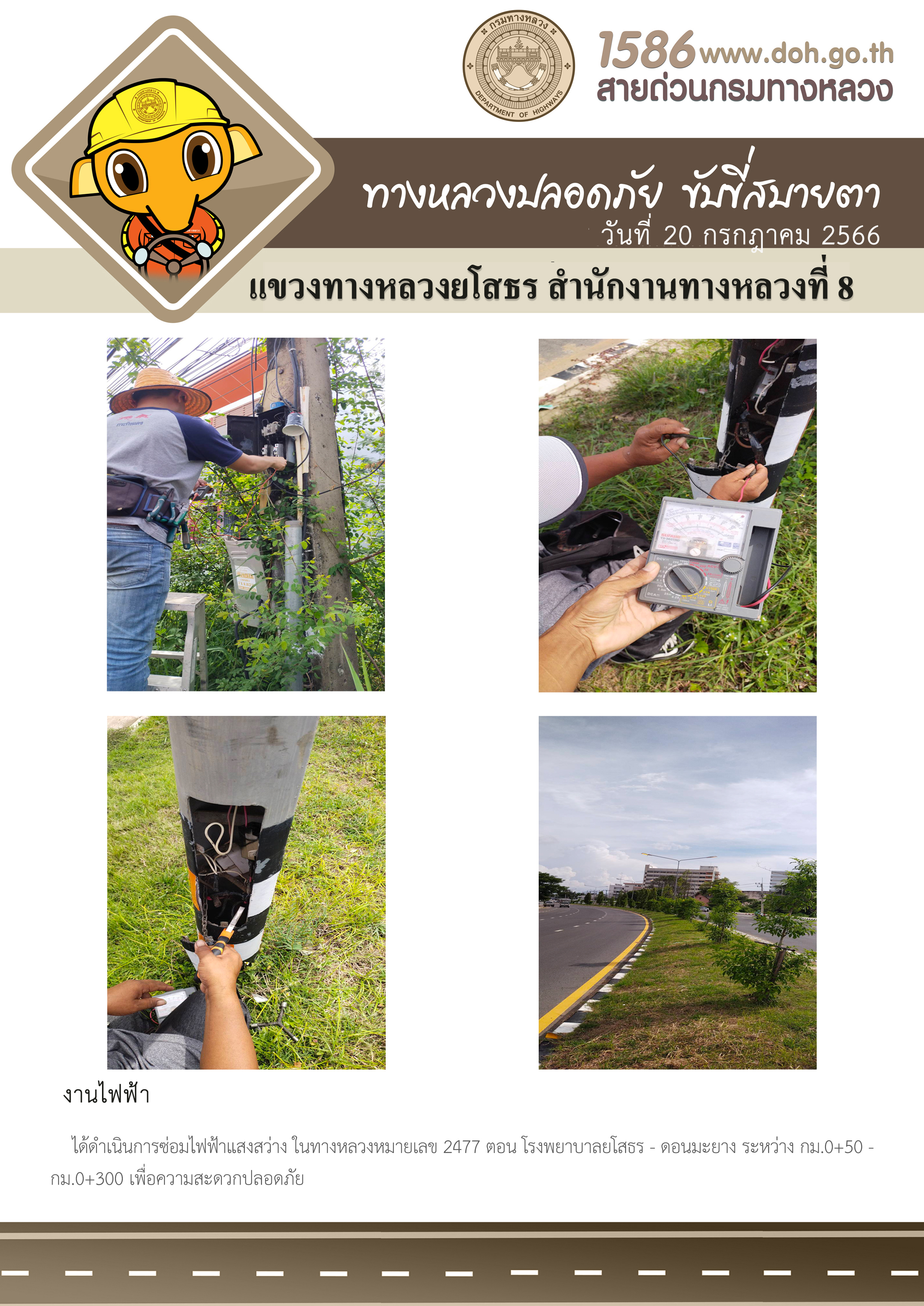 วันที่ 20 กรกฎาคม 2566 งานไฟฟ้า ได้ดำเนินการซ่อมไฟฟ้าแสงสว่าง ในทางหลวงหมายเลข 2477 ตอน โรงพยาบาลยโสธร - ดอนมะยาง ระหว่าง กม.0+500 - กม.0+300 เพื่อความสะดวกปลอดภัย