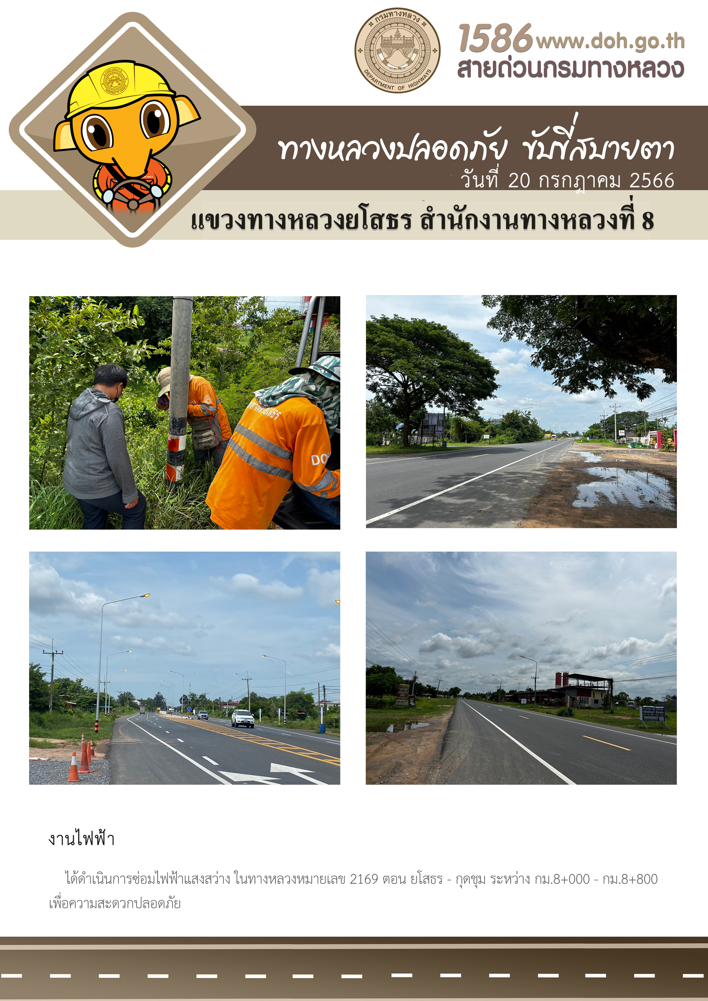 วันที่ 20 กรกฎาคม 2566 งานไฟฟ้า ได้ดำเนินการซ่อมไฟฟ้าแสงสว่าง ในทางหลวงหมายเลข 2169 ตอน ยโสธร - กุดชุม ระหว่าง กม.8+000 - กม.8+800 เพื่อความสะดวกปลอดภัย