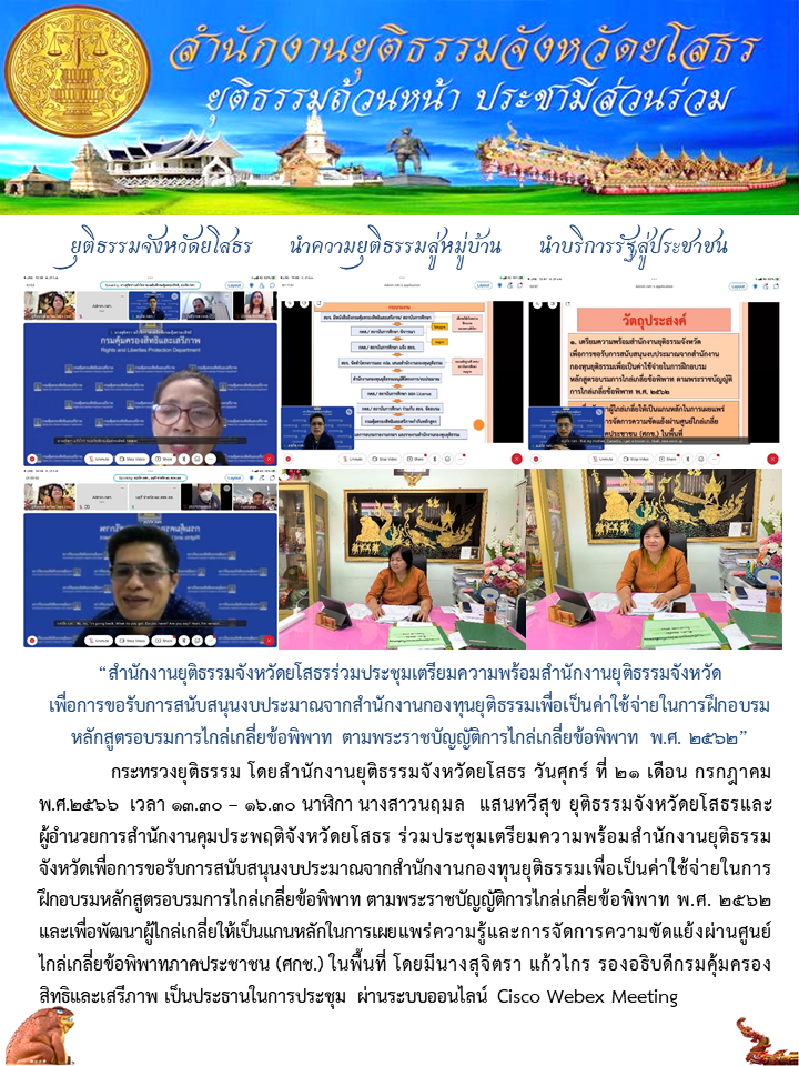 วันที่ 21 ก.ค. 2566 (16:11 น.)กระทรวงยุติธรรม โดยสำนักงานยุติธรรมจังหวัดยโสธร วันศุกร์ ที่ 21 เดือน กรกฎาคม พ.ศ.2566 เวลา 13.30 – 16.30 นาฬิกา นางสาวนฤมล แสนทวีสุข ยุติธรรมจังหวัดยโสธรและ ผู้อำนวยการสำนักงานคุมประพฤติจังหวัดยโสธร ร่วมประชุมเตรียมความพร้อมสำนักงานยุติธรรมจังหวัดเพื่อการขอรับการสนับสนุนงบประมาณจากสำนักงานกองทุนยุติธรรมเพื่อเป็นค่าใช้จ่ายในการฝึกอบรมหลักสูตรอบรมการไกล่เกลี่ยข้อพิพาท ตามพระราชบัญญัติการไกล่เกลี่ยข้อพิพาท พ.ศ. 2562 และเพื่อพัฒนาผู้ไกล่เกลี่ยให้เป็นแกนหลักในการเผยแพร่ความรู้และการจัดการความขัดแย้งผ่านศูนย์ไกล่เกลี่ยข้อพิพาทภาคประชาชน (ศกช.) ในพื้นที่ โดยมีนางสุจิตรา แก้วไกร รองอธิบดีกรมคุ้มครองสิทธิและเสรีภาพ เป็นประธานในการประชุม ผ่านระบบออนไลน์ Cisco Webex Meeting