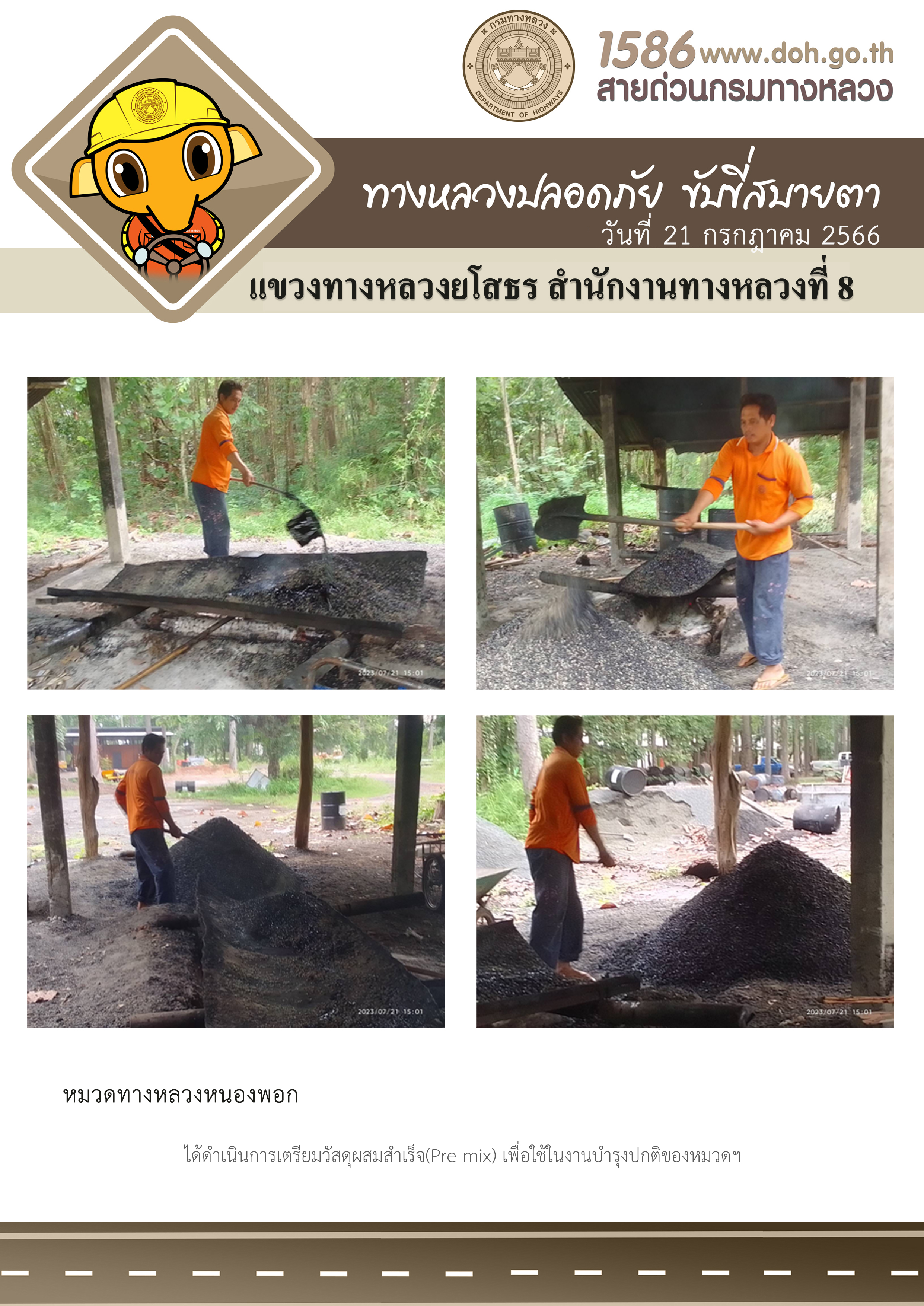 วันที่ 21 กรกฎาคม 2566 หมวดทางหลวงหนองพอก ได้ดำเนินการเตรียมวัสดุผสมสำเร็จ (Pre mix) เพื่อใช้ในงานบำรุงปกติของหมวดฯ
