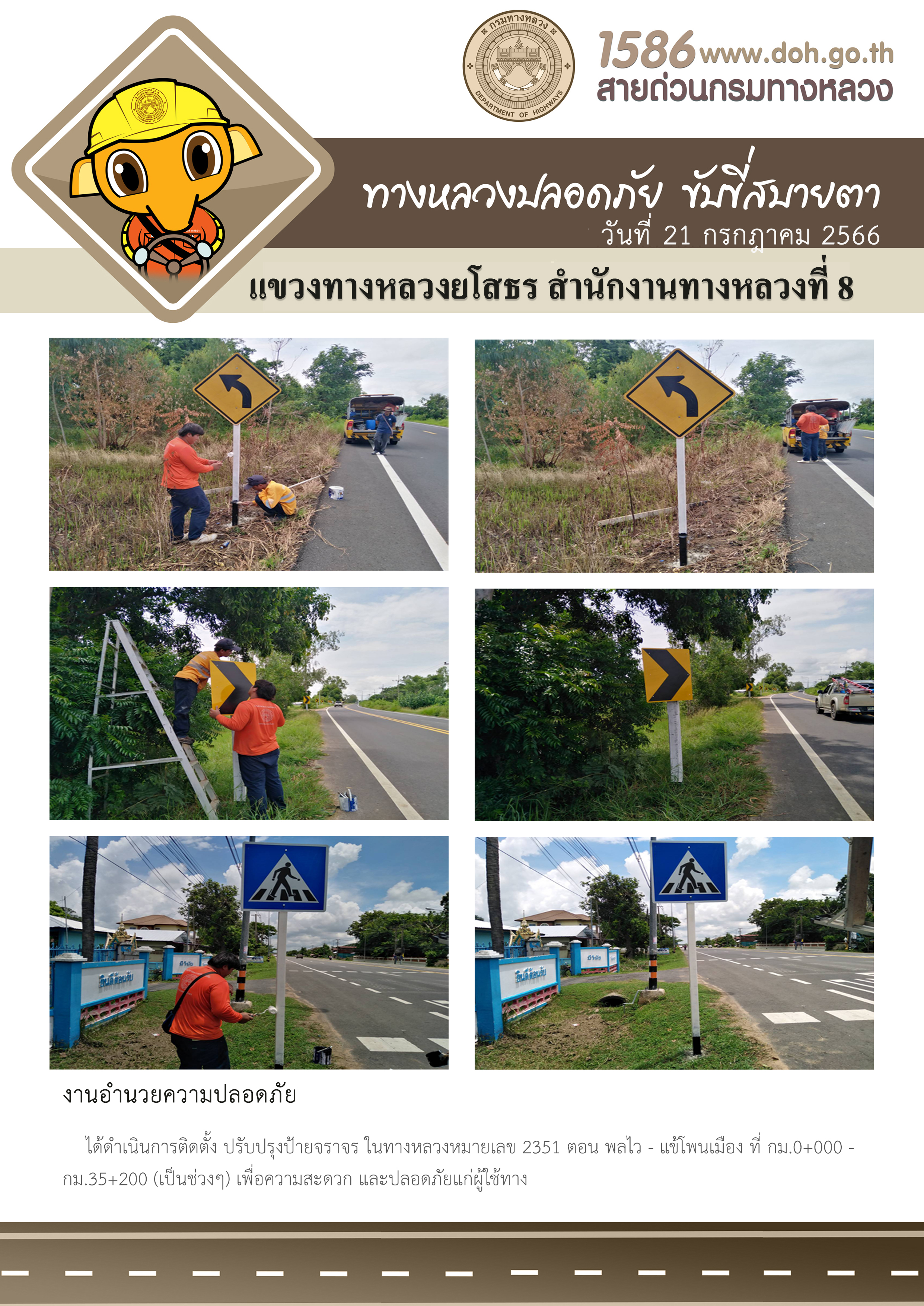 วันที่ 21 กรกฎาคม 2566 งานอำนวยความปลอดภัย ได้ดำเนินการติดตั้ง ปรับปรุงป้ายจราจร ในทางหลวงหมายเลข 2351 ตอน พลไว - แข้โพนเมือง ที่ กม.0+000 - กม.35+200 (เป็นช่วงๆ) เพื่อความสะดวก และปลอดภัยแก่ผู้ใช้ทาง