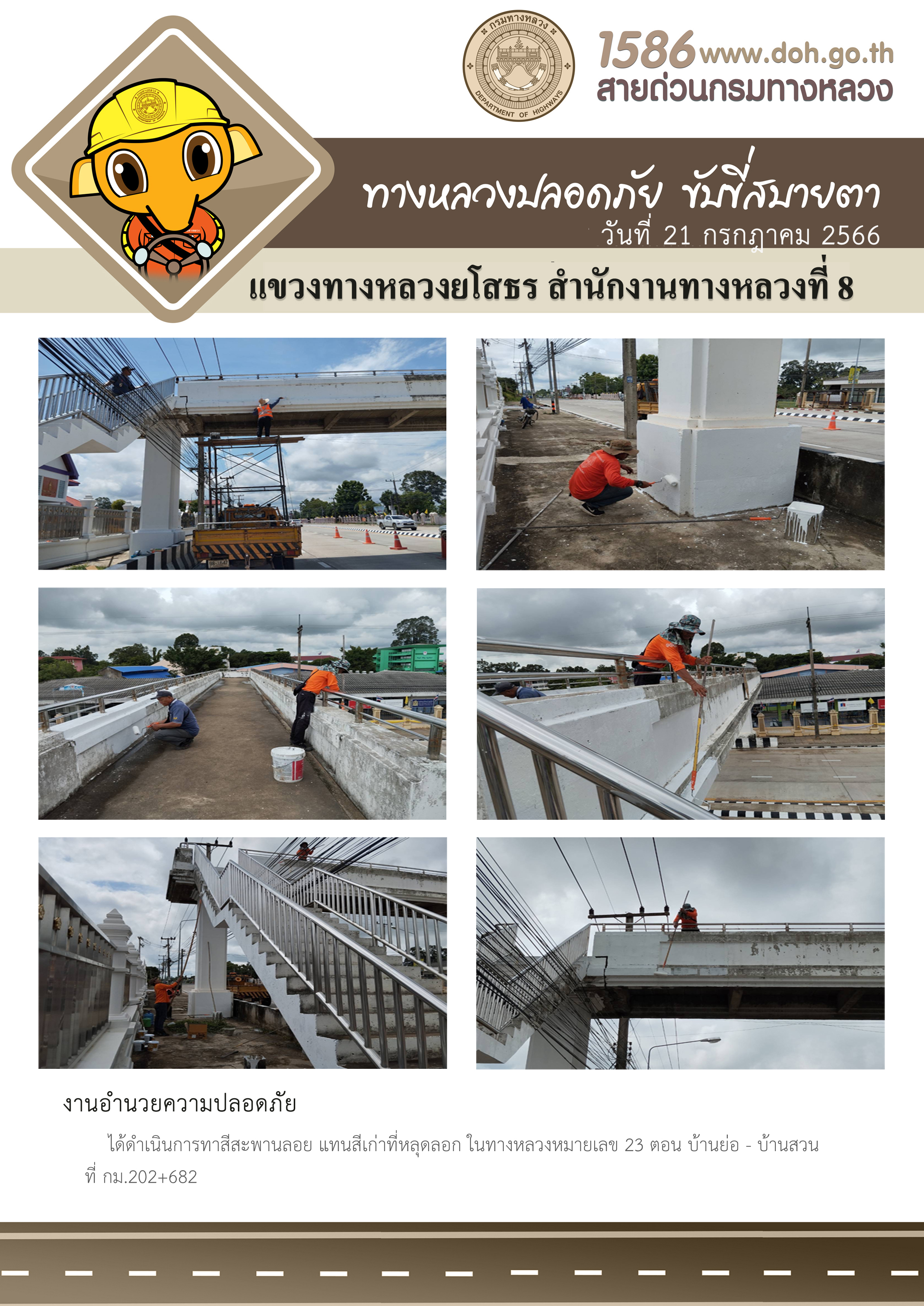 วันที่ 21 กรกฎาคม 2566 งานอำนวยความปลอดภัย ได้ดำเนินการทาสีสะพานลอย แทนสีเก่าที่หลุดลอก ในทางหลวงหมายเลข 23 ตอน บ้านย่อ - บ้านสวน ที่ กม.202+682