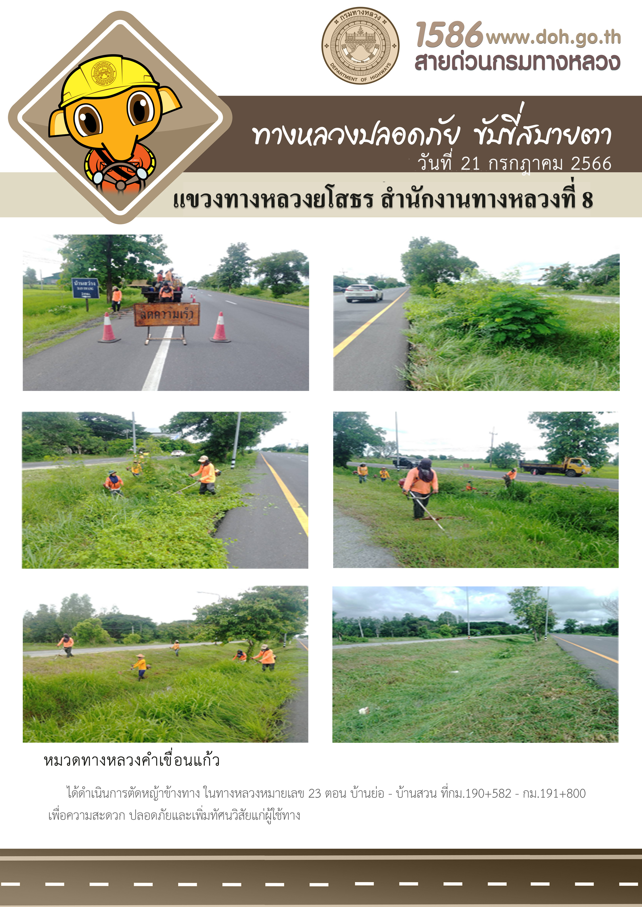 - [10:14] ทั่วไป วันอังคารที่ 31 มีนาคม 2569 หมวดทางหลวงคำเขื่อนแก้ว ได้ดำเนินการตัดหญ้าข้างทาง ในทางหลวงหมายเลข 23 ตอน บ้านย่อ - บ้านสวน ระหว่าง กม.204+000 - กม.205+000 เพื่อความสะดวก ปลอดภัย และเพิ่มทัศนวิสัยแก่ผู้ใช้ทาง