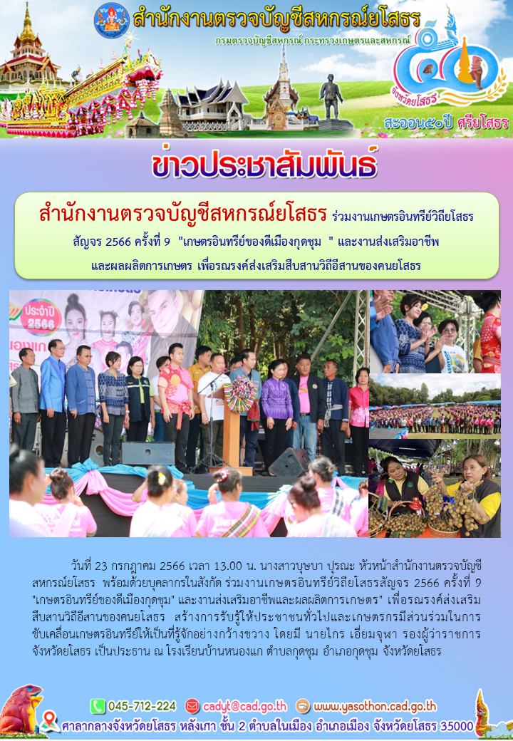 สำนักงานตรวจบัญชีสหกรณ์ยโสธร ร่วมงานเกษตรอินทรีย์วิถียโสธรสัญจร 2566 ครั้งที่ 9 "เกษตรอินทรีย์ของดีเมืองกุดชุม " และงานส่งเสริมอาชีพ และผลผลิตการเกษตร เพื่อรณรงค์ส่งเสริมสืบสานวิถีอีสานของคนยโสธร