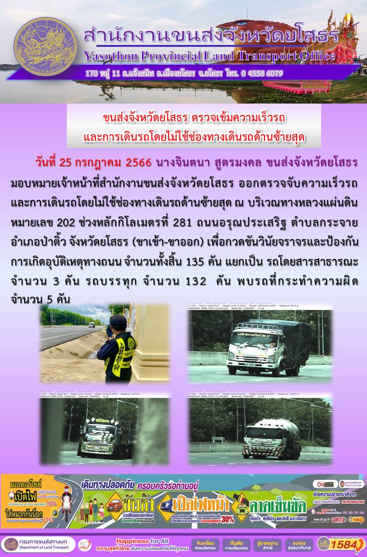 วันที่ 25 กรกฎาคม 2566 เจ้าหน้าที่สำนักงานขนส่งจังหวัดยโสธร ออกตั้งจุดตรวจจับความเร็ว