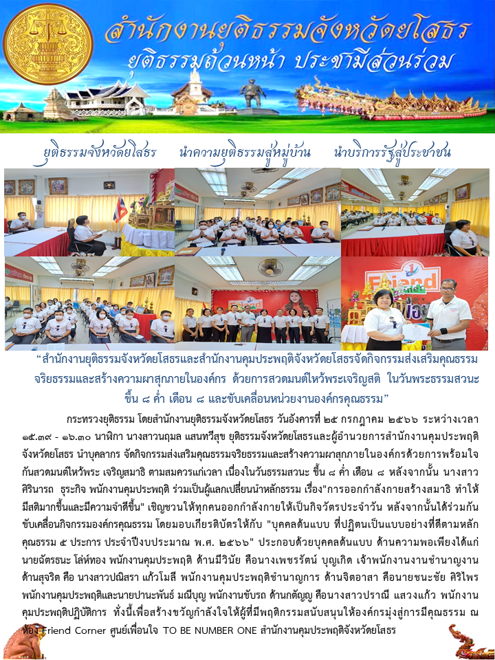 สำนักงานยุติธรรมจังหวัดยโสธรและสำนักงานคุมประพฤติจังหวัดยโสธรจัดกิจกรรมส่งเสริมคุณธรรมจริยธรรมและสร้างความผาสุกภายในองค์กร ด้วยการสวดมนต์ไหว้พระเจริญสติ ในวันพระธรรมสวนะ ขึ้น ๘ ค่ำ เดือน ๘ และขับเคลื่อนหน่วยงานองค์กรคุณธรรม