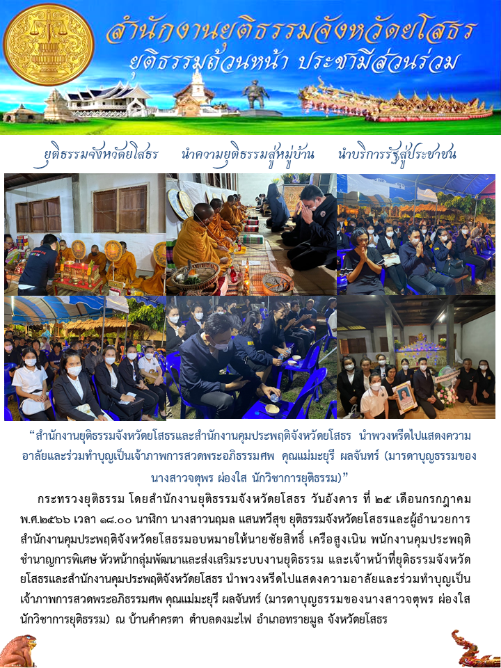 สำนักงานยุติธรรมจังหวัดยโสธรและสำนักงานคุมประพฤติจังหวัดยโสธร นำพวงหรีดไปแสดงความอาลัยและร่วมทำบุญเป็นเจ้าภาพการสวดพระอภิธรรมศพ คุณแม่มะยุรี ผลจันทร์ (มารดาบุญธรรมของนางสาวจตุพร ผ่องใส นักวิชาการยุติธรรม)
