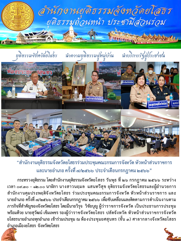 สำนักงานยุติธรรมจังหวัดยโสธรร่วมประชุมคณะกรมการจังหวัด หัวหน้าส่วนราชการ และนายอำเภอ ครั้งที่ 7/2566 ประจำเดือนกรกฎาคม 2566