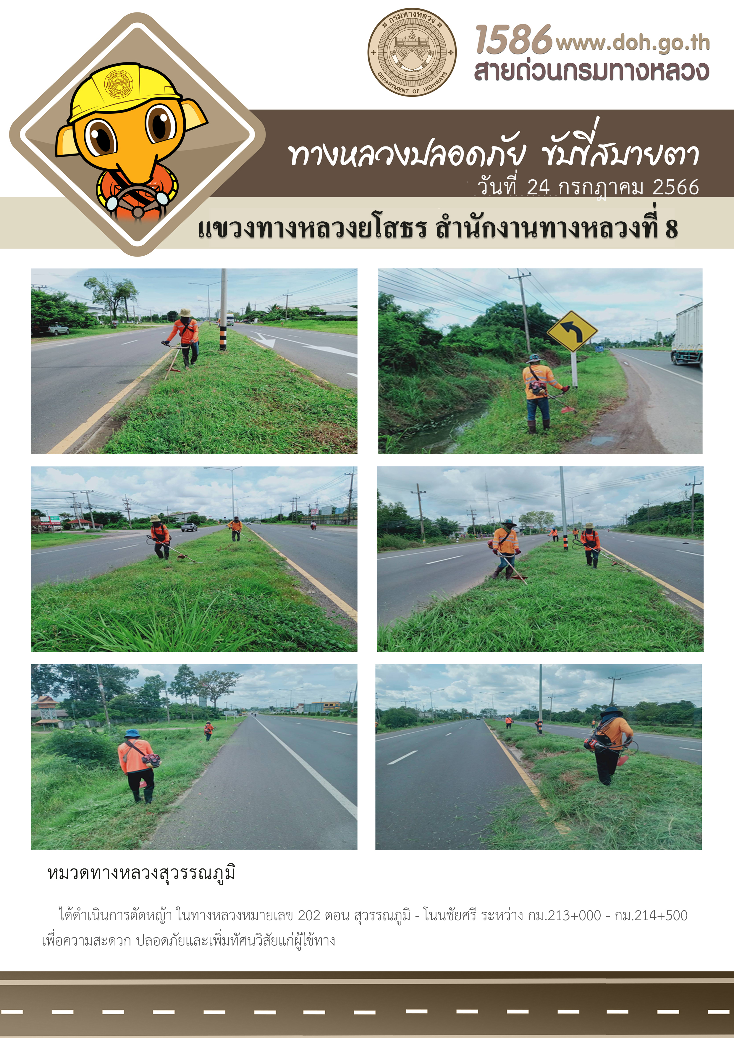 วันที่ 24 กรกฎาคม 2566 หมวดทางหลวงสุวรรณภูมิ ได้ดำเนินการตัดหญ้า ในทางหลวงหมายเลข 202 ตอน สุวรรณภูมิ - โนนชัยศรี ระหว่าง กม.213+000 - กม.214+500 เพื่อความสะดวก ปลอดภัยและเพิ่มทัศนวิสัยแก่ผู้ใช้ทาง