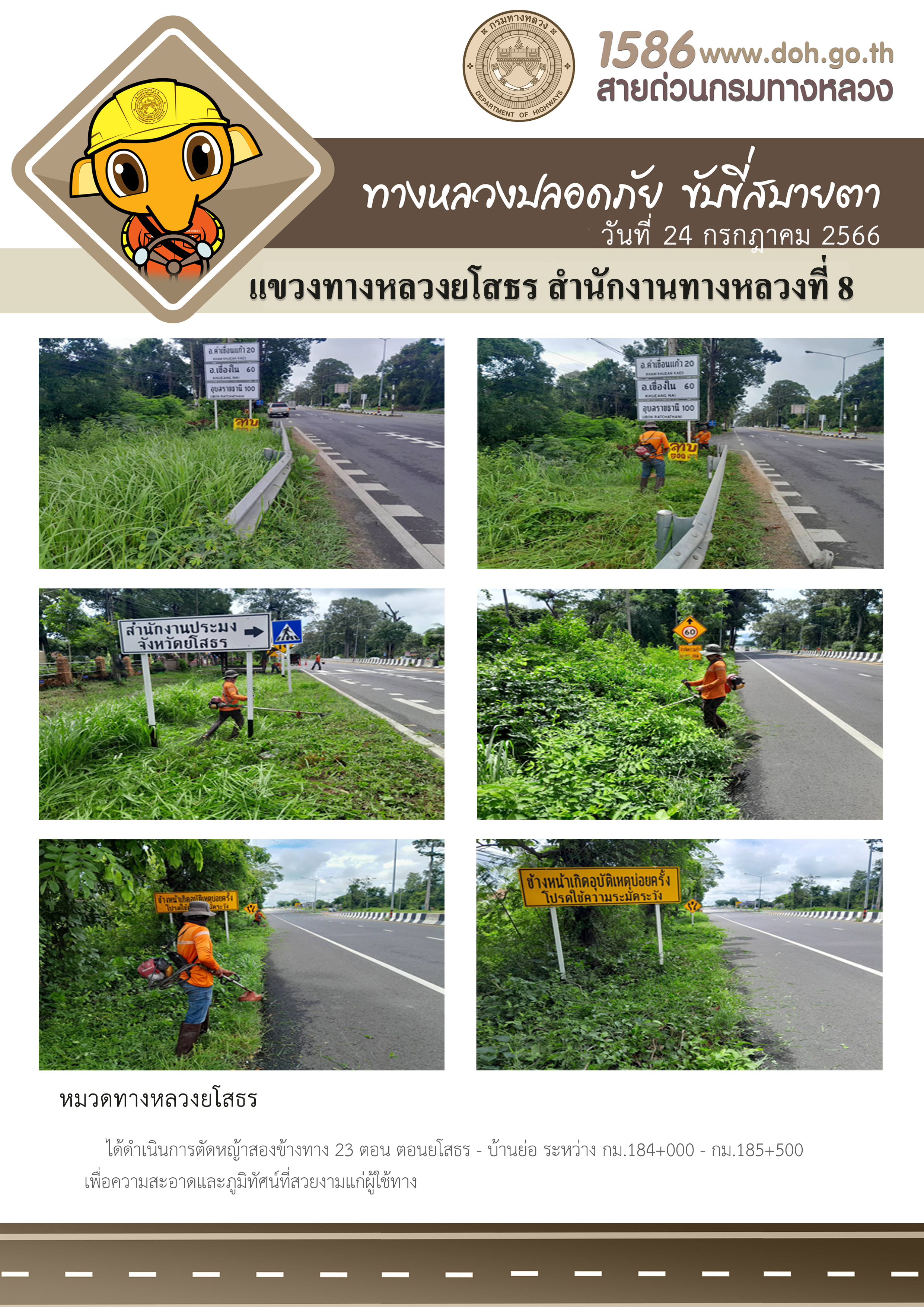วันที่ 24 กรกฎาคม 2566 หมวดทางหลวงยโสธร ได้ดำเนินการตัดหญ้าสองข้างทาง ในทางหลวงหมายเลข 23 ตอน ตอนยโสธร - บ้านย่อ ระหว่าง กม.184+000 - กม.185+500 เพื่อความสะอาดและภูมิทัศน์ที่สวยงามแก่ผู้ใช้ทาง