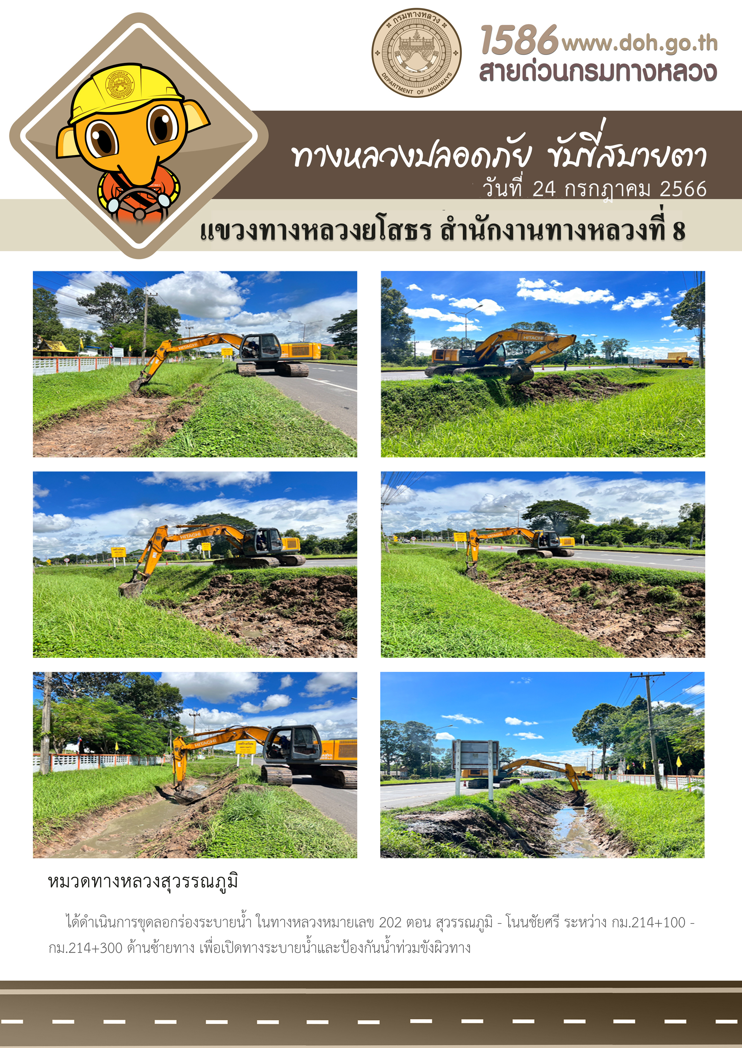 วันที่ 24 กรกฎาคม 2566 หมวดทางหลวงสุวรรณภูมิ ได้ดำเนินการขุดลอกร่องระบายน้ำ ในทางหลวงหมายเลข 202 ตอน สุวรรณภูมิ - โนนชัยศรี ระหว่าง กม.214+100 - กม.214+300 ด้านซ้ายทาง เพื่อเปิดทางระบายน้ำและป้องกันน้ำท่วมขังผิวทาง