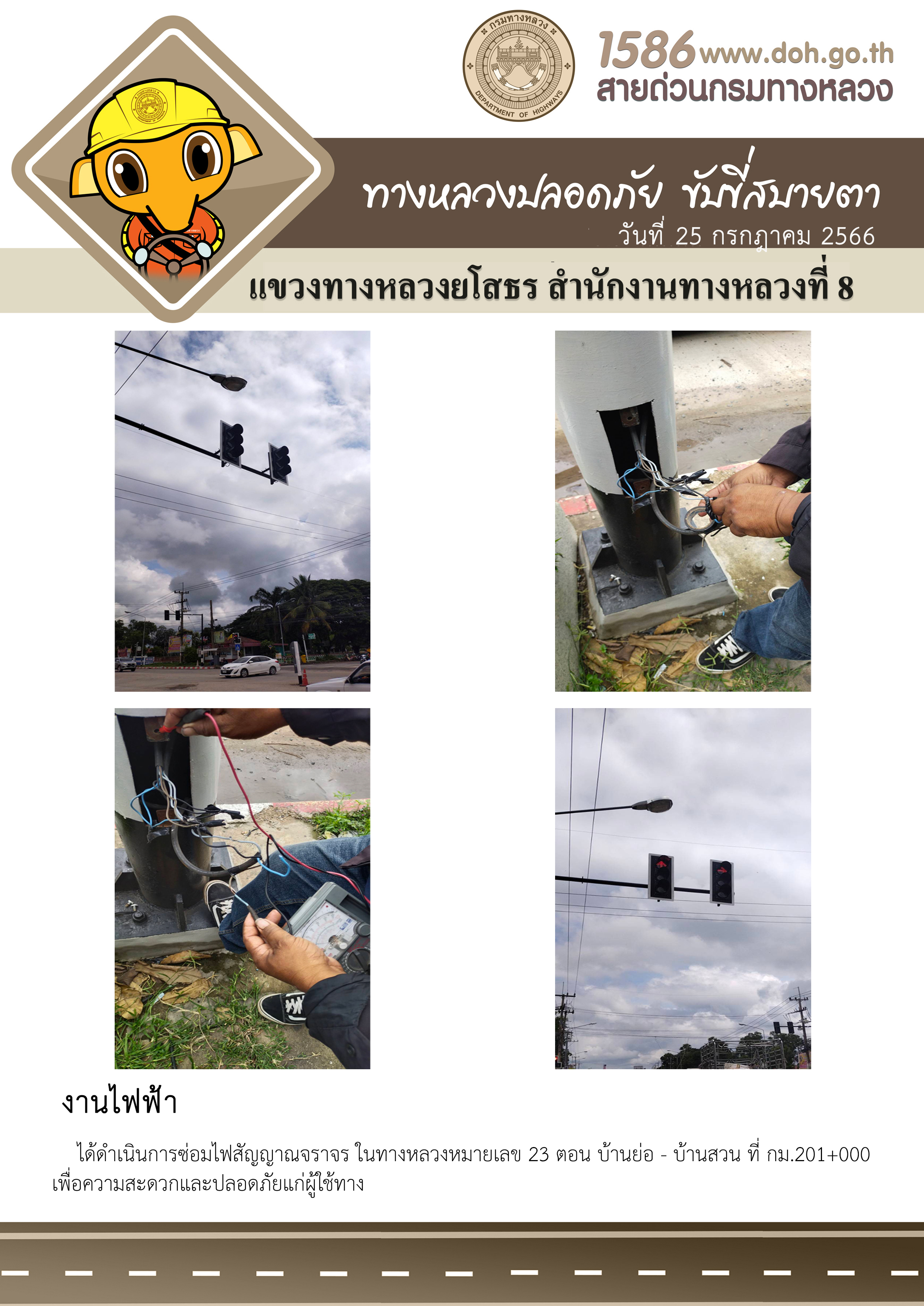 วันที่ 25 กรกฎาคม 2566 งานไฟฟ้า ได้ดำเนินการซ่อมไฟสัญญาณจราจร ในทางหลวงหมายเลข 23 ตอน บ้านย่อ - บ้านสวน ที่ กม.201+000 เพื่อความสะดวกและปลอดภัยแก่ผู้ใช้ทาง