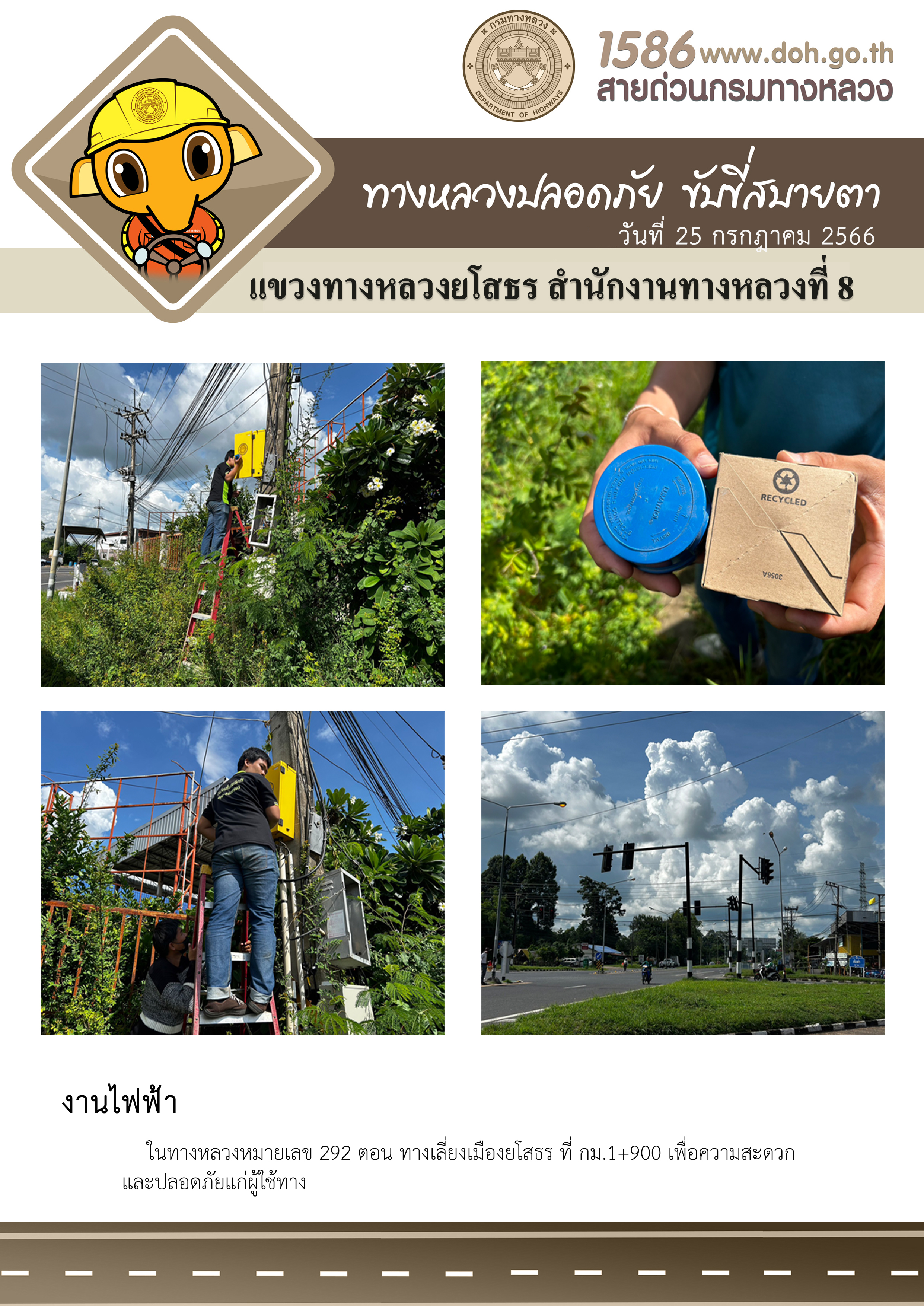 วันที่ 25 กรกฎาคม 2566 งานไฟฟ้า ในทางหลวงหมายเลข 292 ตอน ทางเลี่ยงเมืองยโสธร ที่ กม.1+900 เพื่อความสะดวก และปลอดภัยแก่ผู้ใช้ทาง