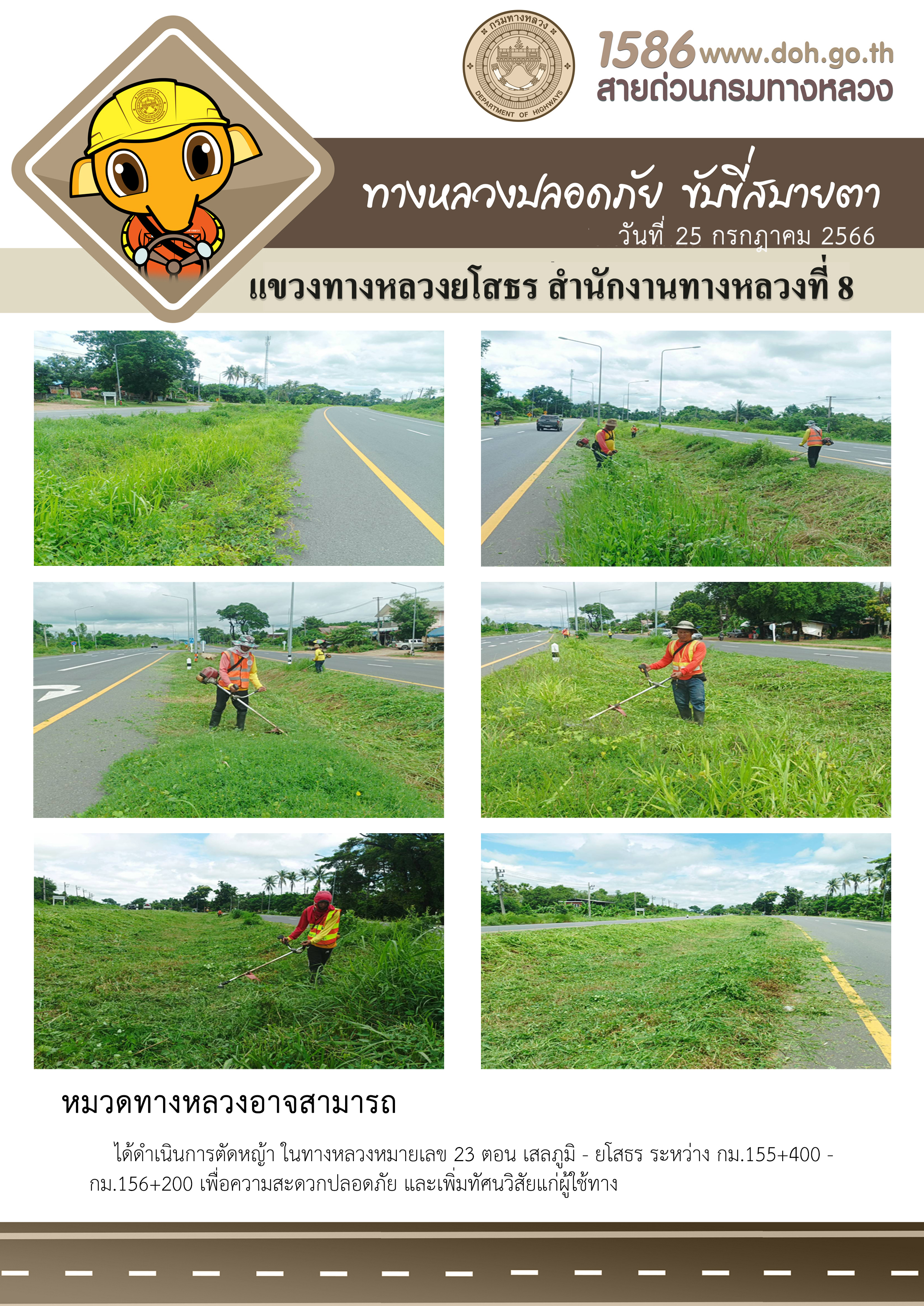 วันที่ 25 กรกฎาคม 2566 หมวดทางหลวงอาจสามารถ ได้ดำเนินการตัดหญ้า ในทางหลวงหมายเลข 23 ตอน เสลภูมิ - ยโสธร ระหว่าง กม.155+400 - กม.156+200 เพื่อความสะดวกปลอดภัย และเพิ่มทัศนวิสัยแก่ผู้ใช้ทาง