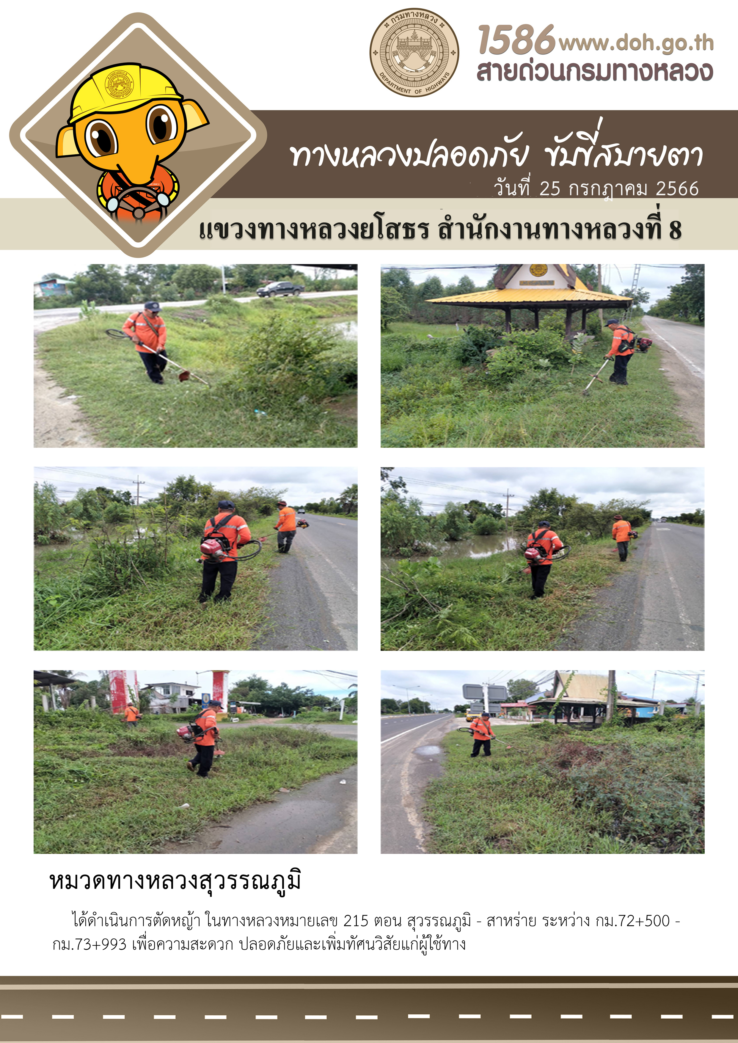 วันที่ 25 กรกฎาคม 2566 หมวดทางหลวงสุวรรณภูมิ ได้ดำเนินการตัดหญ้า ในทางหลวงหมายเลข 215 ตอน สุวรรณภูมิ - สาหร่าย ระหว่าง กม.72+500- กม.73+993 เพื่อความสะดวก ปลอดภัยและเพิ่มทัศนวิสัยแก่ผู้ใช้ทาง