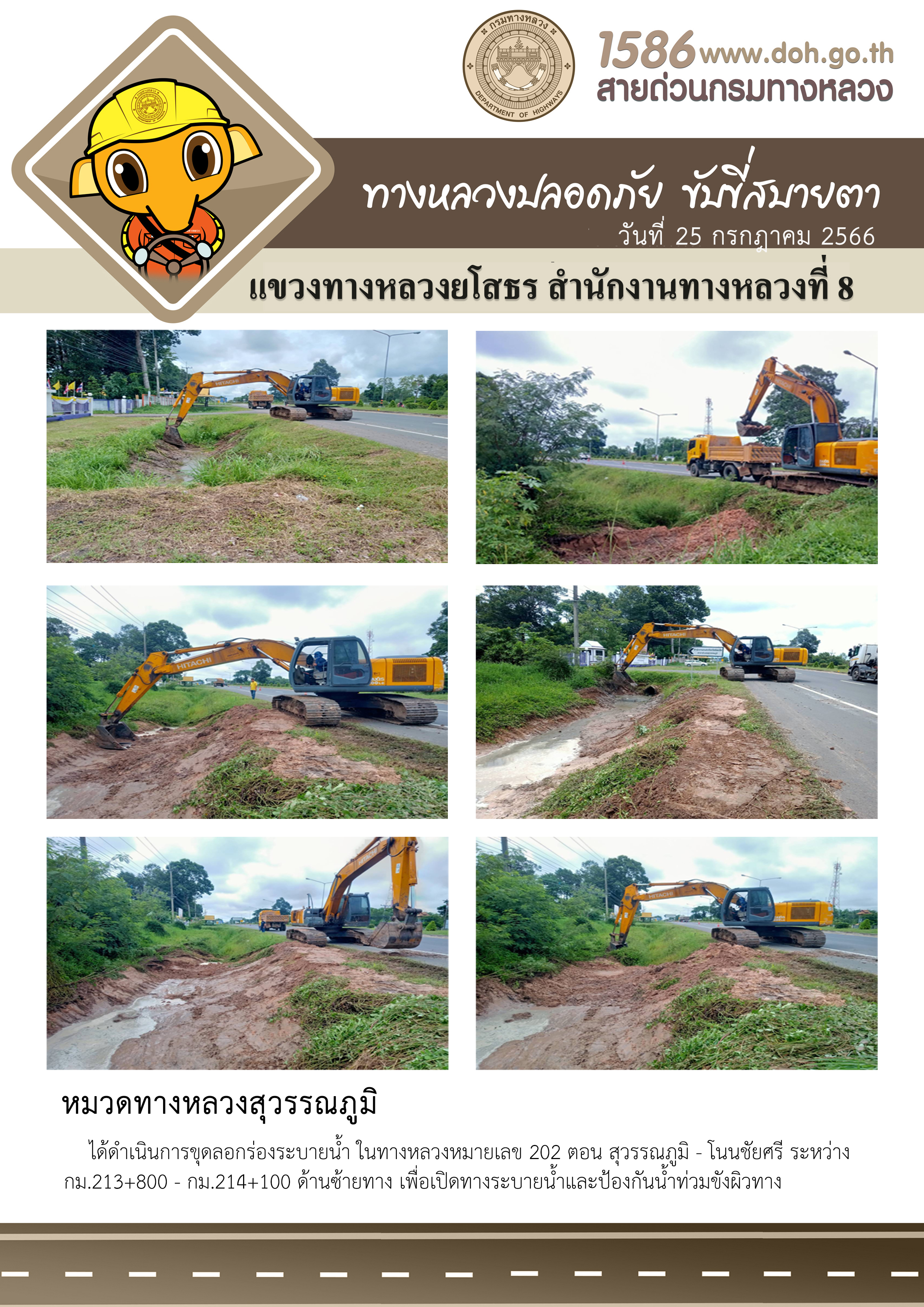วันที่ 25 กรกฎาคม 2566 หมวดทางหลวงสุวรรณภูมิ ได้ดำเนินการขุดลอกร่องระบายน้ำ ในทางหลวงหมายเลข 202 ตอน สุวรรณภูมิ - โนนชัยศรี ระหว่าง กม.213+800 - กม.214+100 ด้านซ้ายทาง เพื่อเปิดทางระบายน้ำและป้องกันน้ำท่วมขังผิวทาง