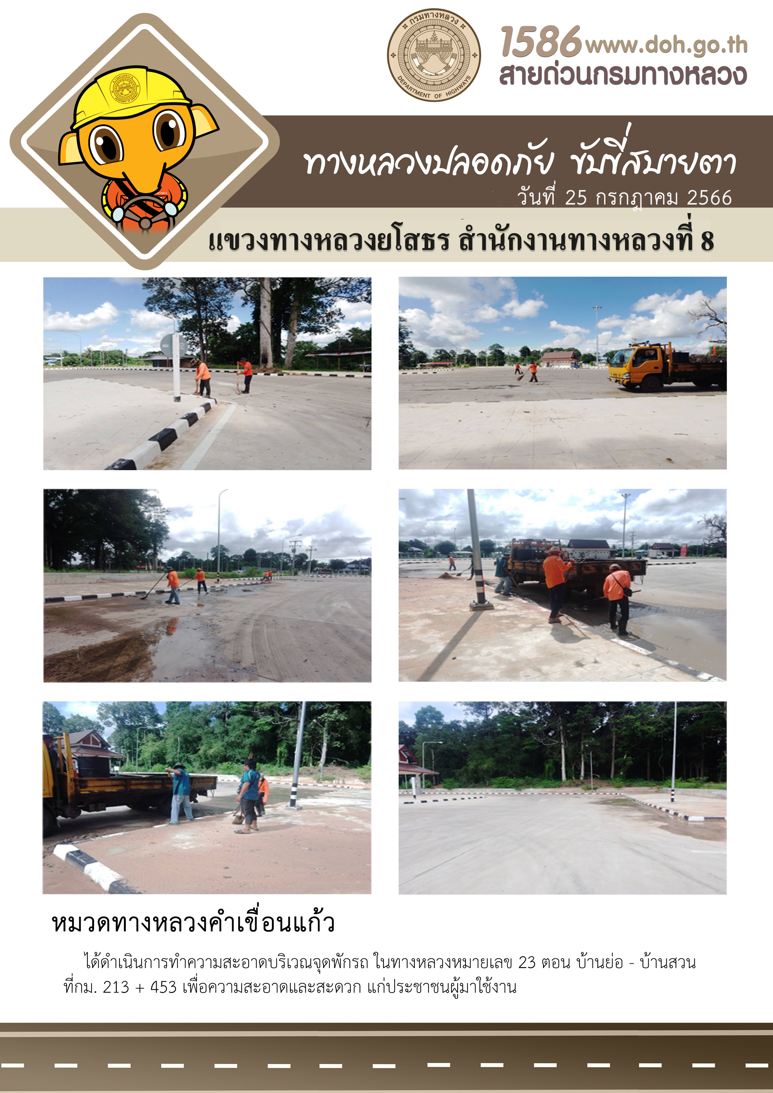 วันที่ 25 กรกฎาคม 2566 หมวดทางหลวงคำเขื่อนแก้ว ได้ดำเนินการทำความสะอาดบริเวณจุดพักรถ ในทางหลวงหมายเลข 23 ตอน บ้านย่อ - บ้านสวน ที่กม. 213+453 เพื่อความสะอาดและสะดวก แก่ประชาชนผู้มาใช้งาน