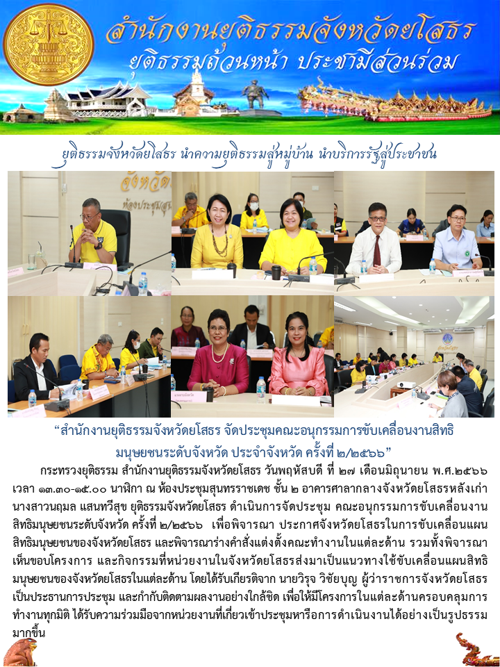 สำนักงานยุติธรรมจังหวัดยโสธร จัดประชุมคณะอนุกรรมการขับเคลื่อนงานสิทธิมนุษยชนระดับจังหวัด ประจำจังหวัด ครั้งที่ 2/2566