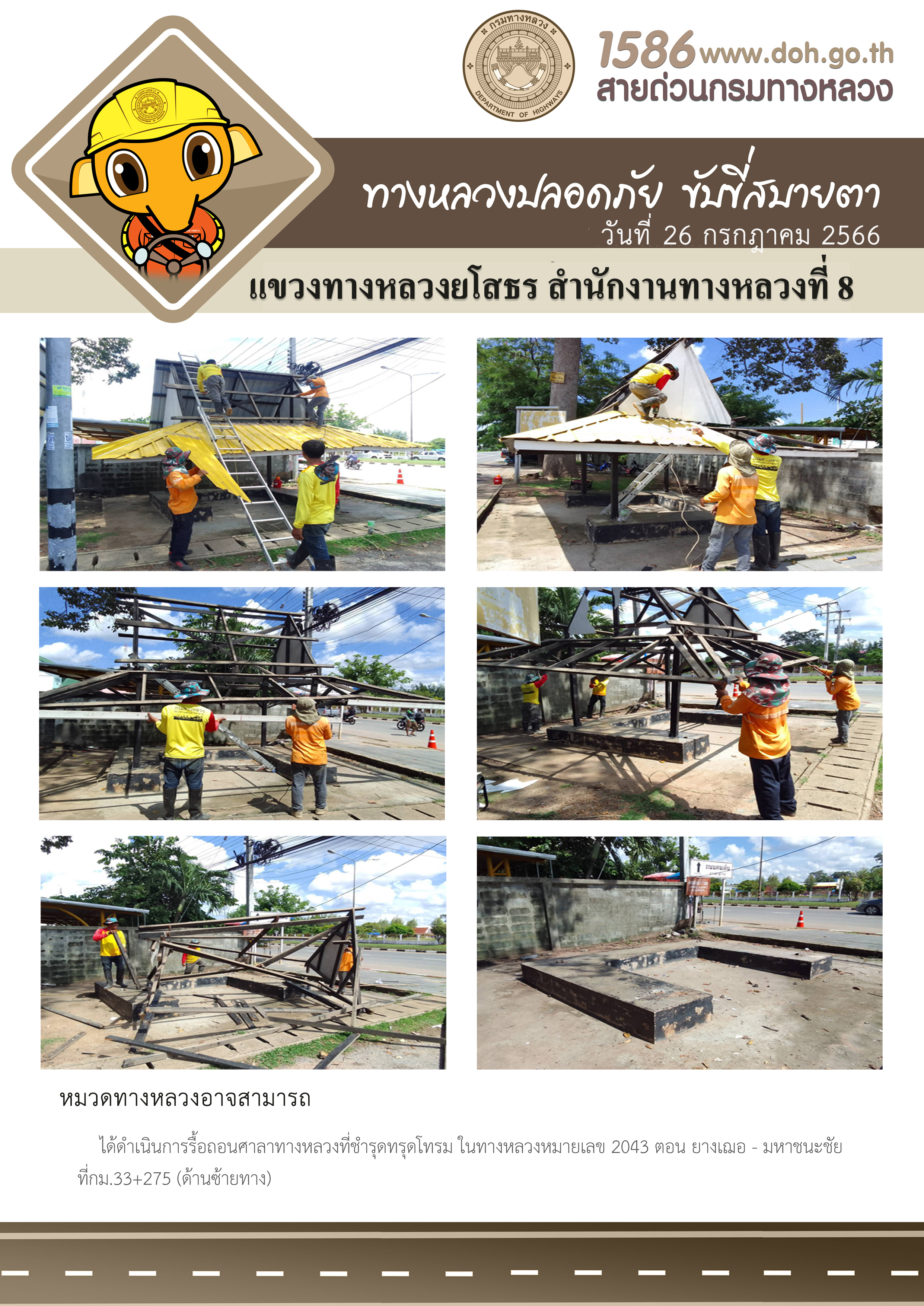 วันที่ 26 กรกฎาคม 2566 หมวดทางหลวงอาจสามารถ ได้ดำเนินการรื้อถอนศาลาทางหลวงที่ชำรุดทรุดโทรม ในทางหลวงหมายเลข 2043 ตอน ยางเฌอ - มหาชนะชัย ที่กม.33+275 (ด้านซ้ายทาง)