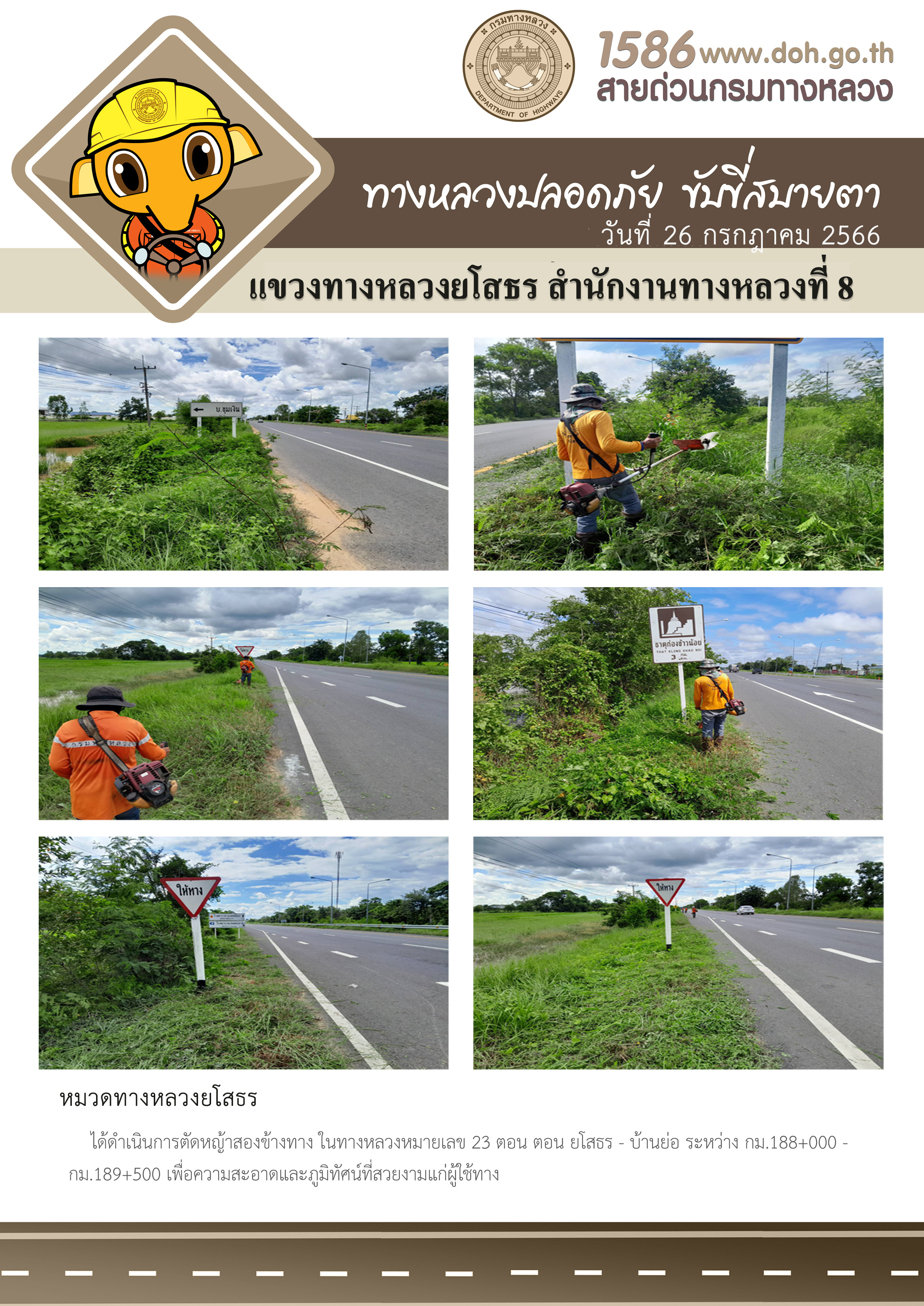 วันที่ 26 กรกฎาคม 2566 หมวดทางหลวงยโสธร ได้ดำเนินการตัดหญ้าสองข้างทาง ในทางหลวงหมายเลข 23 ตอน ตอน ยโสธร - บ้านย่อ ระหว่าง กม.188+000 - กม.189 +500 เพื่อความสะอาดและภูมิทัศน์ที่สวยงามแก่ผู้ใช้ทาง
