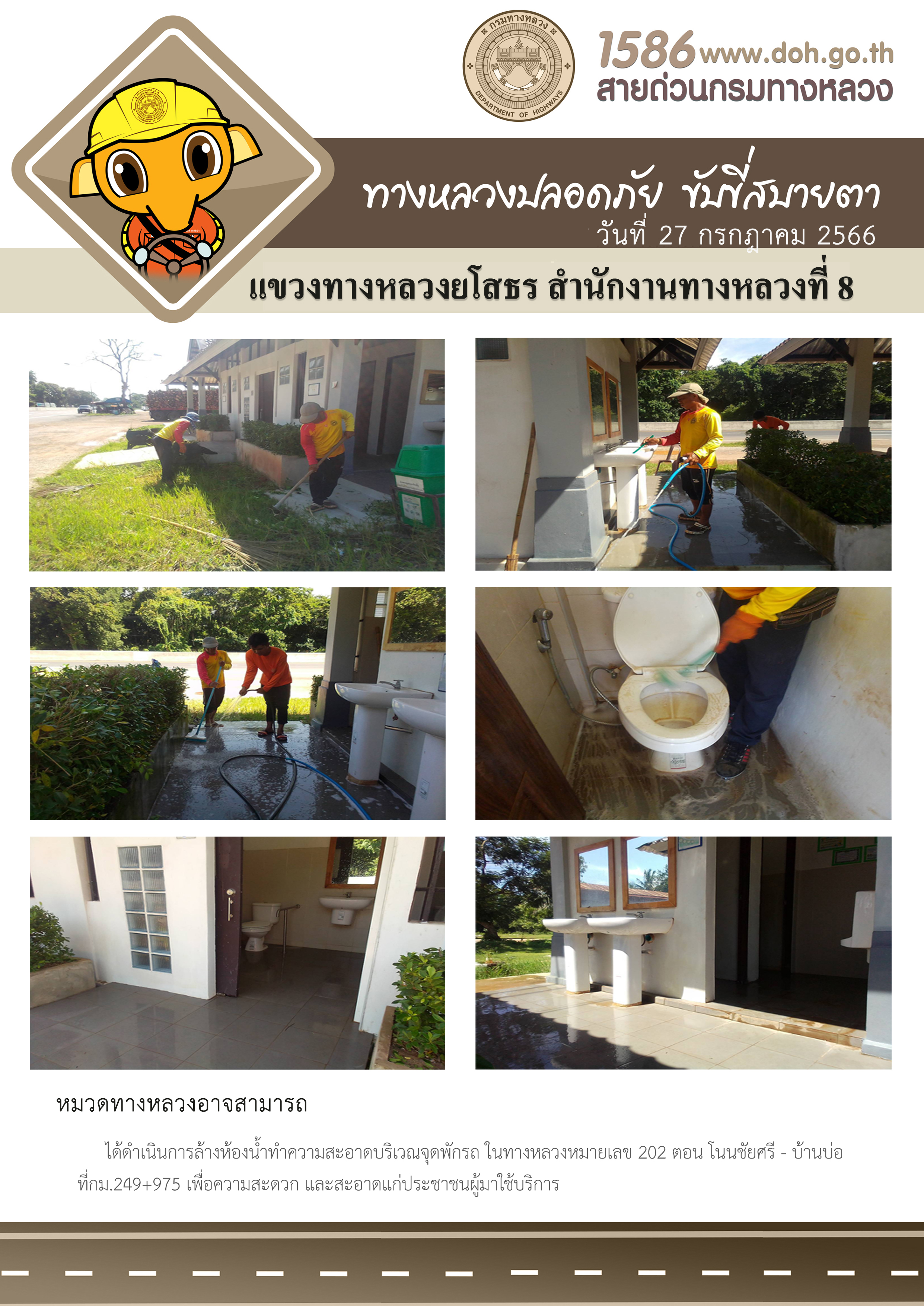 วันที่ 27 กรกฎาคม 2566 หมวดทางหลวงอาจสามารถ ได้ดำเนินการล้างห้องน้ำทำความสะอาดบริเวณจุดพักรถ ในทางหลวงหมายเลข 202 ตอน โนนชัยศรี - บ้านบ่อ ที่ กม.249+975 เพื่อความสะดวก และสะอาดแก่ประชาชนผู้มาใช้บริการ